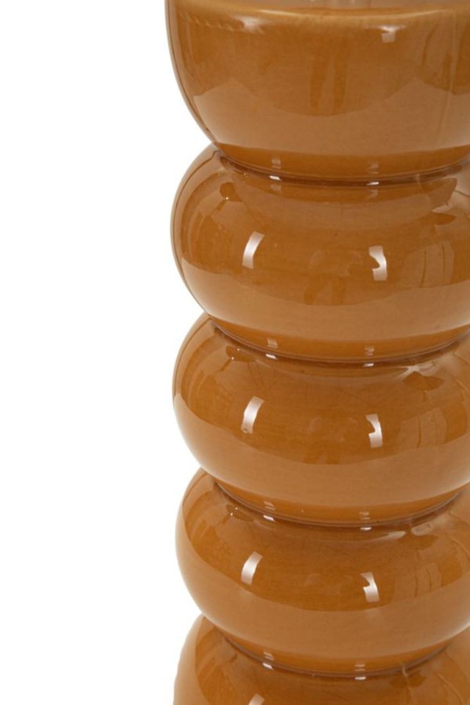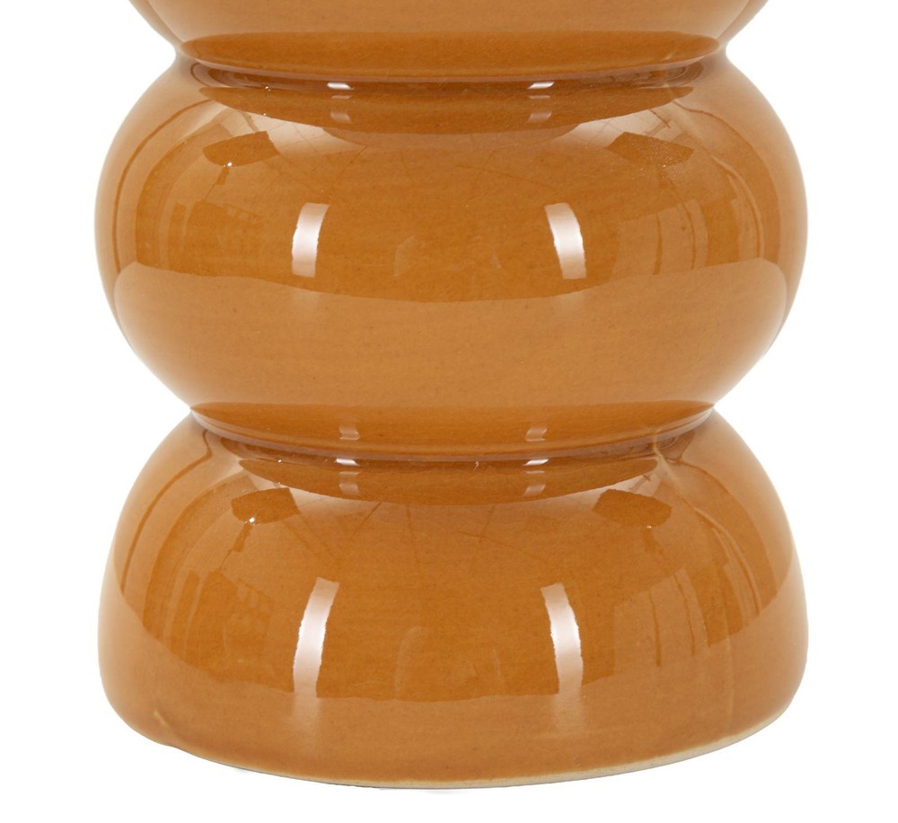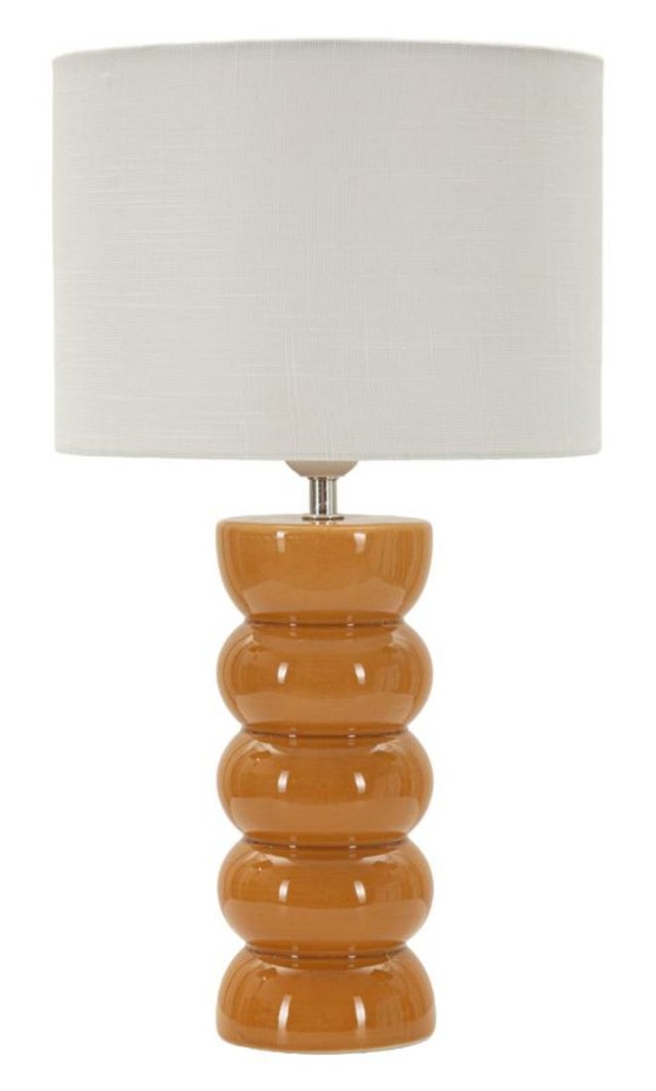 Diese Tischlampe zieht mit ihrem lebendigen, modernen Design sofort alle Blicke auf sich. Der Sockel aus glänzender oranger Keramik besteht aus mehreren übereinander angeordneten, abgerundeten Elementen, die eine skulpturale, organische Wirkung erzeugen und der Lampe eine unverwechselbare Präsenz verleihen. Ein silbernes Detail an der Oberseite setzt einen eleganten Akzent und rundet das auffällige Design harmonisch ab. Der Lampenschirm aus weißem Stoff sorgt für eine sanfte Lichtstreuung und kreiert eine warme, einladende Atmosphäre. Die Kombination aus leuchtendem Orange, klaren Linien und metallischem Highlight macht die Lampe zu einem dekorativen Statement, das modernen Wohnräumen Farbe und Charakter verleiht. Mit den Maßen von ca. 25 x 46 x 25 cm (Breite x Höhe x Tiefe) ist die Lampe kompakt genug für vielfältige Platzierungen, wirkt dabei aber dennoch präsent und markant. Sie verbindet kunstvolles Design, hochwertige Materialien und stimmungsvolles Licht auf elegante Weise und wird zu einem besonderen Highlight in jedem Raum.