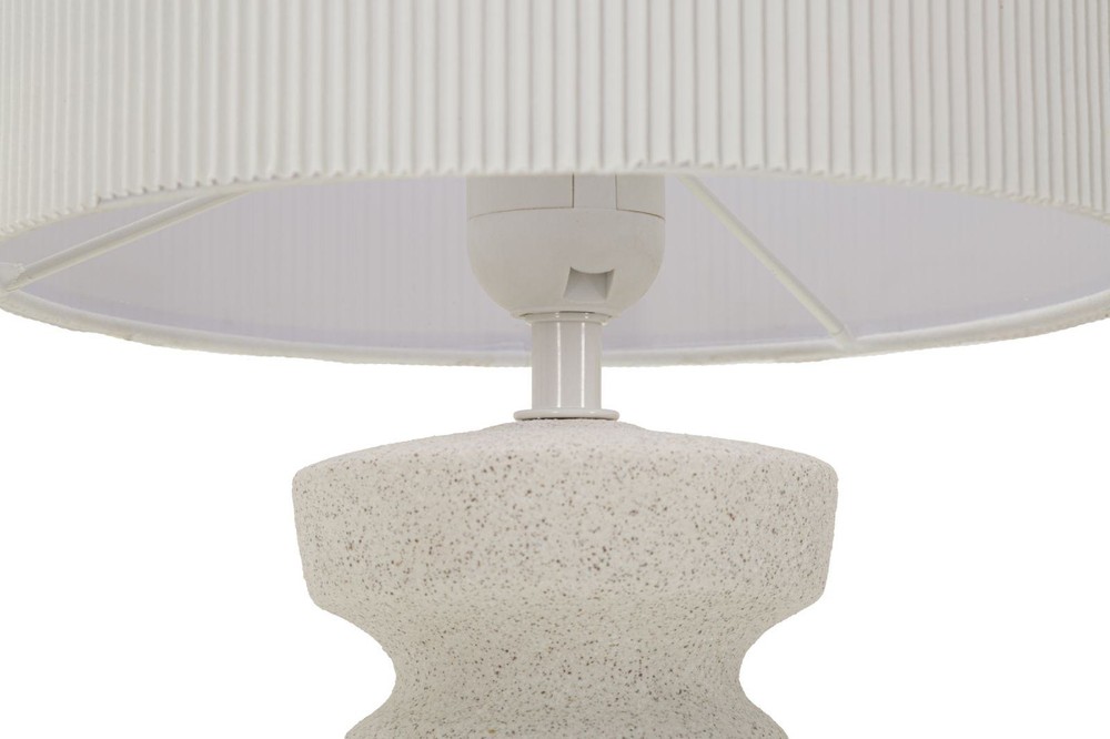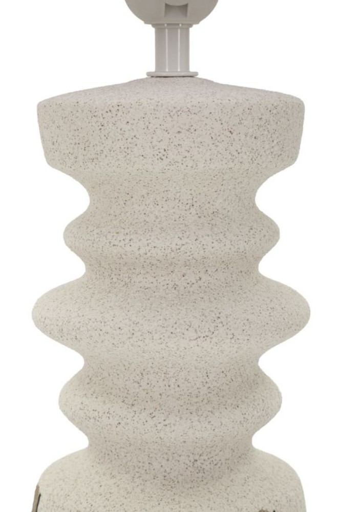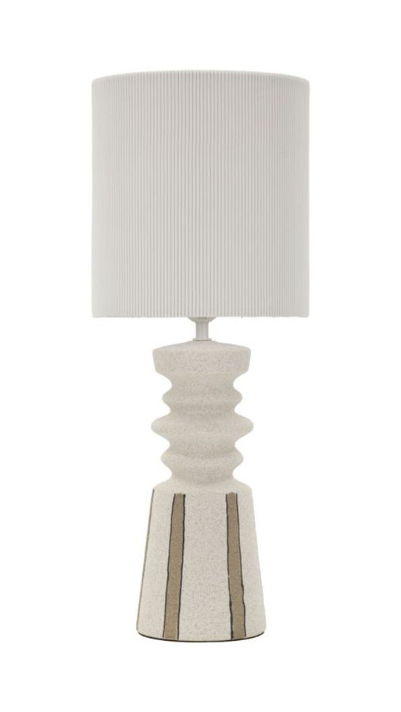Diese Tischlampe besticht durch ihr skulpturales, von modernen Tribal-Formen inspiriertes Design und setzt einen stilvollen Akzent in jedem Raum. Der Sockel aus Keramik in hellem Beige überrascht mit einer organischen, geschwungenen Form, die sich harmonisch in die Umgebung einfügt. Dezente braune Streifen am unteren Bereich sorgen für einen authentischen, handwerklichen Charakter und verleihen der Lampe Tiefe und Struktur. Der Lampenschirm aus weißem Stoff ist mit feinen, senkrechten Rillen versehen, die das Licht sanft streuen und für eine warme, einladende Atmosphäre sorgen. Die Kombination aus organischer Form, texturierter Oberfläche und dezenten Farbkontrasten macht die Lampe zu einem dekorativen Statement, das moderne Ästhetik mit subtilen Tribal-Elementen verbindet. Mit den Maßen von ca. 22,5 x 57 x 22,5 cm (Breite x Höhe x Tiefe) ist die Lampe kompakt genug, um flexibel eingesetzt zu werden, und wirkt gleichzeitig präsent und markant. Sie vereint kunstvolles Design, hochwertige Materialien und stimmungsvolles Licht auf besondere Weise und verleiht jedem Raum eine elegante, moderne Note.