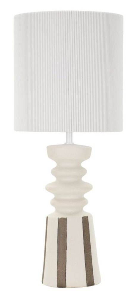 Diese Tischlampe besticht durch ihr skulpturales Design und verbindet moderne Eleganz mit subtilen tribal-inspirierten Akzenten. Der Sockel aus Keramik in warmem Beige überrascht mit seiner organischen, fließenden Form, die von braunen, vertikalen Streifen verziert wird. Diese feinen Gravuren verleihen der Lampe Tiefe und Struktur und lassen sie wie ein kunstvolles Dekoelement wirken. Der Lampenschirm aus weißem Stoff mit senkrechten Rillen setzt das gestalterische Konzept fort und sorgt gleichzeitig für ein weiches, angenehmes Licht, das eine warme und einladende Atmosphäre schafft. Die Kombination aus skulpturalem Sockel und strukturiertem Schirm macht die Lampe zu einem dekorativen Highlight, das sowohl moderne als auch ethnisch inspirierte Wohnstile harmonisch ergänzt. Mit den Maßen von ca. 26,5 x 67 x 26,5 cm (Breite x Höhe x Tiefe) ist die Lampe präsent genug, um Aufmerksamkeit zu erregen, ohne den Raum zu dominieren. Ihr einzigartiges Design, hochwertige Keramikverarbeitung und stimmungsvolles Licht machen sie zu einem idealen Statement-Piece für jedes Interieur.