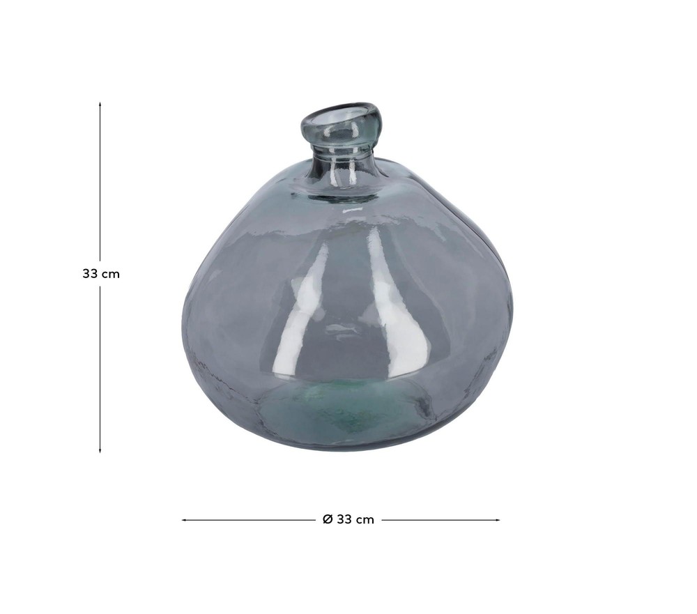 Diese elegante Vase aus recyceltem Glas überzeugt durch ihre besondere Ausstrahlung und einen bewussten Umgang mit Materialien. Die fein blaugetönte Glasoberfläche verleiht dem Objekt eine ruhige, moderne Tiefe und erzeugt – insbesondere im Zusammenspiel mit natürlichem Licht – faszinierende Lichtreflexe. Dadurch werden Blumen, Zweige oder dekorative Arrangements stilvoll hervorgehoben und erhalten eine ganz eigene Wirkung. Die organische Formgebung mit weich fließenden Linien sorgt für eine natürliche, harmonische Anmutung und macht die Vase zu einem zeitlosen Gestaltungselement. Mit einer großzügigen Stauraumgröße von 14 Litern bietet sie ausreichend Platz für üppige Blumenarrangements, saisonale Dekorationen oder kreative Gestaltungsideen. Dank des robusten, recycelten Glases eignet sich die Vase ideal für den Außenbereich. Ob auf der Terrasse, dem Balkon oder im Garten – sie setzt stilvolle Akzente und fügt sich zugleich dezent in ihre Umgebung ein. Mit ihren Maßen von ca. 33 × 33 × 33 cm (Breite × Höhe × Tiefe) besitzt die Vase eine markante Präsenz, ohne dabei aufdringlich zu wirken. Jede Vase ist durch die Verwendung von recyceltem Glas ein individuelles Unikat und steht für einen verantwortungsvollen, nachhaltigen Lebensstil. Entscheiden Sie sich für ein dekoratives Objekt, das Design, Funktionalität und Umweltbewusstsein auf elegante Weise verbindet – vielseitig einsetzbar und das ganze Jahr über ein stilvoller Blickfang.