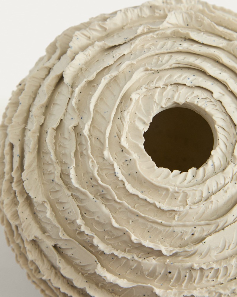 Diese elegante Vase aus beiger Keramik vereint kunstvolles Design mit natürlicher Schlichtheit und wird so zu einem stilvollen Highlight in jedem Raum. Ihre runde Form und das überlappende Design verleihen der Vase eine besondere Dynamik und moderne Ästhetik, die sowohl minimalistische als auch eklektische Einrichtungskonzepte bereichert. Jede Vase ist handgedreht und damit ein echtes Unikat. Die individuelle Textur und leichte Unregelmäßigkeiten im Material machen jede Vase einzigartig und unterstreichen den handwerklichen Charakter des Stücks. Dieses detailreiche, handwerkliche Finish sorgt dafür, dass die Vase nicht nur funktional, sondern auch als dekoratives Kunstobjekt wirkt. Mit ihren Maßen von ca. 16,5 x 15,5 x 16,5 cm (Breite x Höhe x Tiefe) besitzt die Vase eine kompakte, harmonische Größe, die sich vielseitig auf Sideboards, Beistelltischen, Regalen oder Fensterbänken platzieren lässt. Sie eignet sich sowohl für einzelne Blumen oder Zweige als auch als stilvolles Dekoelement ohne florale Füllung. Diese Vase kombiniert hochwertige Keramik, handwerkliche Präzision und ein modernes Design zu einem außergewöhnlichen Wohnaccessoire, das jedem Raum Wärme, Charakter und einen Hauch künstlerischer Individualität verleiht.