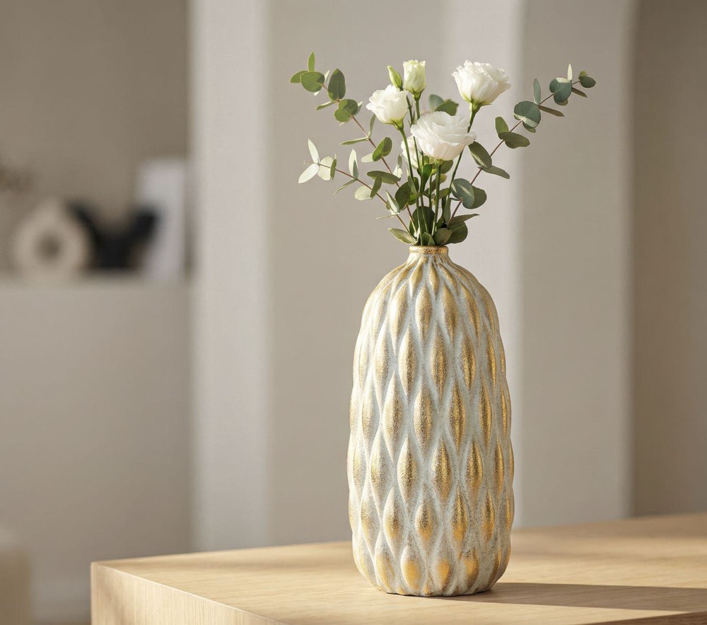 Diese beeindruckende Vase aus Keramik vereint modernes Design mit kunstvoller Handwerkskunst und wird zum eleganten Blickfang in Ihrem Zuhause. In einem zeitlosen Grauton gehalten, besticht sie durch ihre markante Reliefstruktur in Form eines Pepita-Musters, die der Oberfläche Tiefe und Lebendigkeit verleiht. Die strukturierte Keramik erzeugt interessante Licht- und Schatteneffekte und sorgt dafür, dass die Vase aus jedem Blickwinkel faszinierend wirkt. Besondere Akzente setzen die feinen goldfarbenen Details, die harmonisch in das Pepita-Relief eingearbeitet sind. Sie verleihen der Vase einen luxuriösen Touch, der sich stilvoll vom matten Grau abhebt und die hochwertige Verarbeitung unterstreicht. Je nach Lichteinfall entstehen dezente Reflexionen, die der Vase zusätzliche Eleganz und Ausdruckskraft verleihen. Mit ihren Maßen von ca. 18,5 x 37,5 x 18,5 cm (Breite x Höhe x Tiefe) besitzt die Vase eine ausdrucksstarke, aber dennoch harmonische Größe. Sie eignet sich ideal für größere Blumenarrangements, Trockenblumen oder Zweige, kann aber auch als eigenständiges Dekorationsobjekt auf Sideboards, Konsolen oder Regalen eingesetzt werden. Durch die Kombination aus modernem Grauton, kunstvoller Reliefstruktur und edlen goldfarbenen Akzenten entsteht ein dekoratives Highlight, das jedem Raum eine elegante, kreative Note verleiht. Diese Vase ist ein Statement für stilbewusste Einrichtung und bringt gleichzeitig Kunst und Design auf eindrucksvolle Weise zusammen.