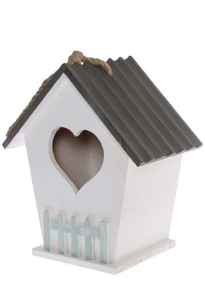 Das Vogelhaus Kiki ist aus Spießtanne und in Weiß mit holzfarbenem Dach. Es hat eine Öffnung in Herzform an der Vorderseite durch welche die Vögel einen sicheren und komfortablen Unterschlupf finden können.  Es ist leicht aufzuhängen und auch optisch ein hübsches Accesoire für ihren Garten.