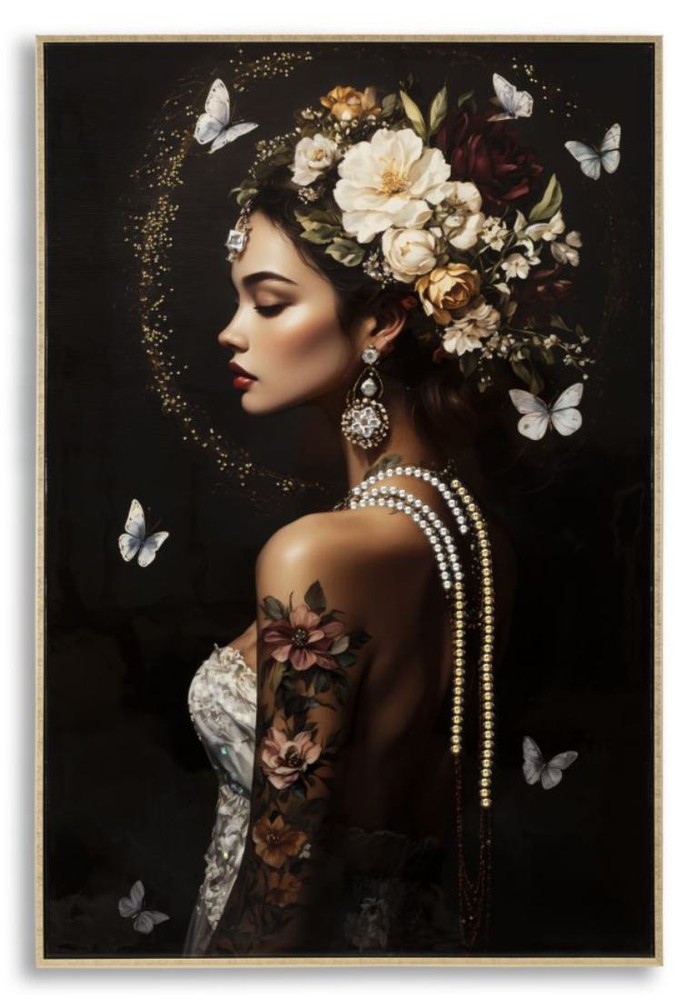Mit ihrer geheimnisvollen Ausstrahlung und der raffinierten Komposition ist dieses Kunstwerk mehr als nur ein Porträt – es ist eine Ode an die Weiblichkeit. Es spricht von Selbstbewusstsein, Eleganz und einer unergründlichen Tiefe, die sowohl in der modernen als auch in der klassischen Kunst eine bedeutende Rolle spielt. Perfekt für Räume, die eine Atmosphäre von Raffinesse und mystischem Charme erzeugen sollen, wird dieses Werk garantiert zum Blickfang in jedem Raum und lässt den Betrachter immer wieder neue Facetten entdecken.