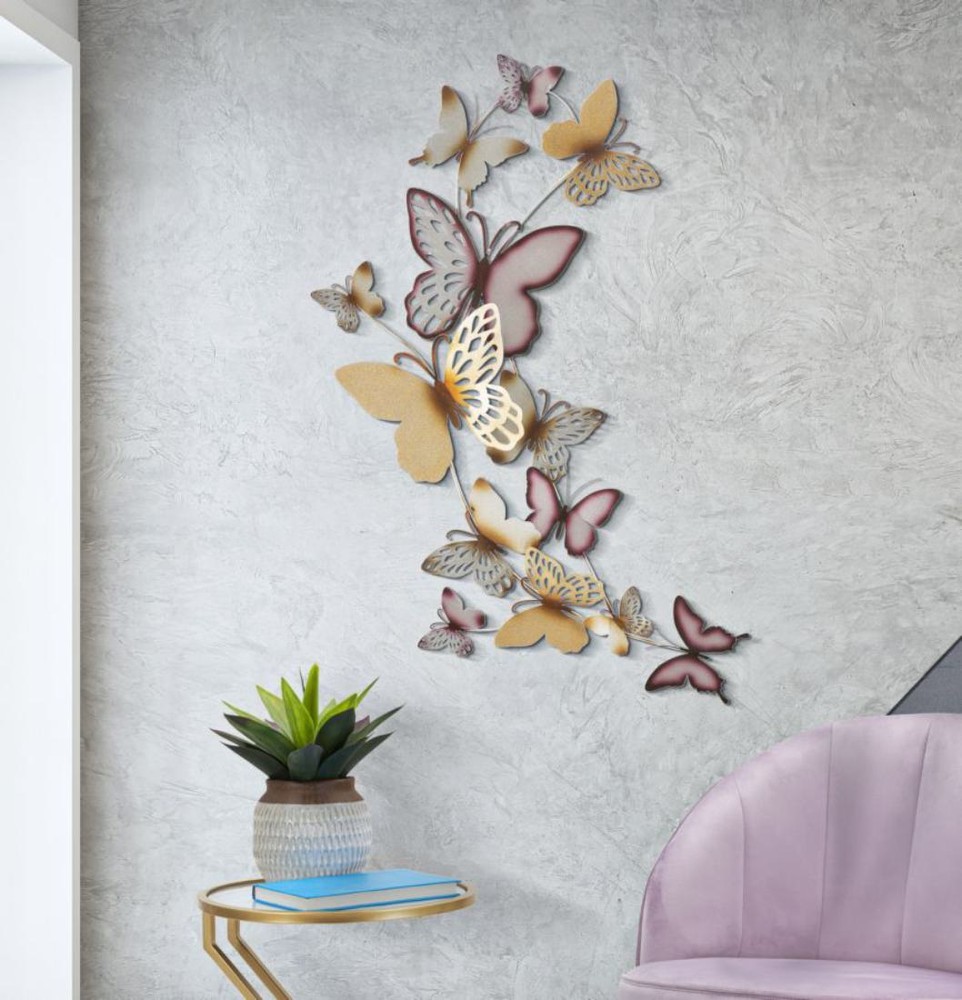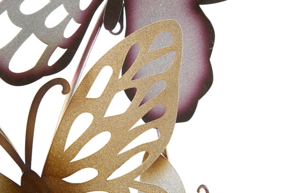 Ein elegantes 3D-Wandpaneel. Filigrane Blumen und Schmetterlinge, kunstvoll in einem Bogen arrangiert. Pastellfarbene Akzente treffen auf goldene Details, eine zarte Kontrastgebung, die jeder Wand sofort Stil und Leichtigkeit verleiht. Dieses dreidimensionale Dekorationspaneel verbindet Bildhauerkunst mit subtiler Farbgebung.