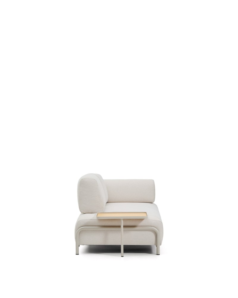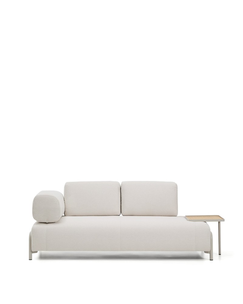 Dieses elegante 2-Sitzer-Modul verbindet durchdachte Funktionalität mit einem zeitlosen, modernen Design. Das Gestell aus pulverbeschichtetem Stahl in einem sanften Beigeton mit feiner Mikrostruktur verleiht dem Sofa nicht nur eine edle, matte Optik, sondern sorgt auch für außergewöhnliche Stabilität und Langlebigkeit. Für den optimalen Sitzkomfort sorgt eine hochwertige Polsterung aus Gurtband und mehreren Schaumstoffschichten mit unterschiedlichen Dichten (28 kg/m³ und 18 kg/m³). Diese Kombination bietet einen mittelfesten Sitz, der sowohl stützend als auch angenehm weich ist – perfekt zum Entspannen, Lesen oder für gemütliche Stunden zu zweit. Besonders praktisch: Eine Armlehne und zwei Rückenlehnen lassen sich mühelos abnehmen, sodass das Sofa im Handumdrehen in ein komfortables Bett mit einer Liegefläche von 98 × 200 cm verwandelt werden kann. Ideal für Gäste oder für Wohnräume, in denen Flexibilität gefragt ist. Ein stilvolles Extra ist das inklusive Tablett mit einem hellgrauen Metallgestell und einer Tischplatte mit edlem Eichenfurnier. Es fügt sich harmonisch in das Design ein und bietet gleichzeitig eine praktische Ablagefläche für Getränke, Bücher oder Deko-Elemente – perfekt abgestimmt auf das Sofa. Der Bezug besteht aus einem doppelseitigen Crevin-Chenille-Gewebe in Écru, das für seine feine Textur, angenehme Haptik und Strapazierfähigkeit bekannt ist. Das Material enthält recyceltes Polyester, ist leicht zu reinigen und somit ideal für den täglichen Gebrauch geeignet. Dank der abnehmbaren Bezüge bleibt das Sofa stets frisch und gepflegt. Mit seiner quadratischen Armlehne, den klaren Linien und den natürlichen Farbtönen fügt sich dieses Modul nahtlos in verschiedenste Einrichtungsstile ein – von modern über skandinavisch bis hin zu elegant-minimalistisch.