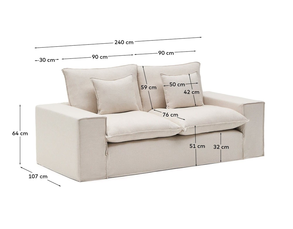 Dieses stilvolle 2-Sitzer-Sofa vereint zeitloses Design, höchsten Sitzkomfort und praktische Pflegeeigenschaften. Der Bezug aus weichem Leinenstoff in Beige vermittelt natürliche Wärme und schafft ein gemütliches Ambiente in Ihrem Wohnzimmer, Schlafzimmer oder offenen Wohnbereich. Durch den abnehmbaren Bezug lässt sich das Sofa einfach reinigen und pflegen, sodass es langfristig seinen eleganten Look behält. Für zusätzlichen Komfort sorgen die zwei dekorativen Kissen, ebenfalls mit abnehmbarem Bezug, die das Sofa perfekt ergänzen und optisch aufwerten. Die Sitz- und Rückenkissen sind mit silikonisierter Mikrofaser mit Daunen-Effekt gefüllt, die ein besonders weiches, flauschiges und einladendes Sitzgefühl garantieren. So wird jedes Platznehmen zu einem echten Wohlfühlerlebnis – ideal zum Entspannen, Lesen oder geselligen Zusammensein. Mit großzügigen Maßen von ca. 240 × 64 × 107 cm (Breite × Höhe × Tiefe) bietet das Sofa genügend Platz für zwei Personen, ohne dass es klobig wirkt. Die harmonische Farbgebung und das natürliche Material fügen sich nahtlos in unterschiedlichste Einrichtungsstile ein – von modern-minimalistisch über skandinavisch-natürlich bis hin zu gemütlich-elegant.
