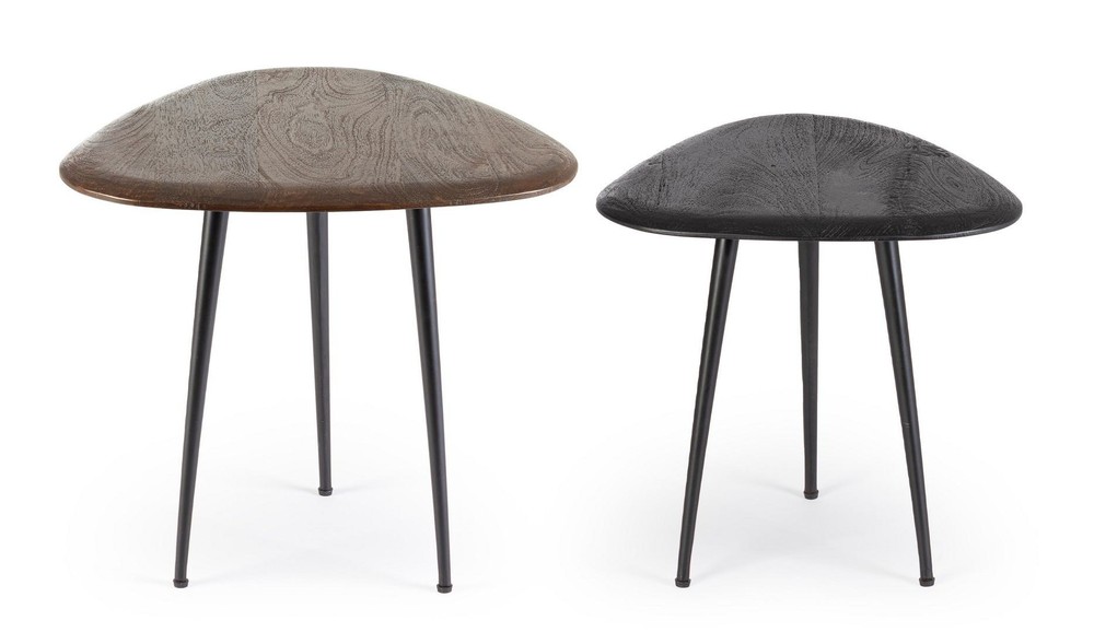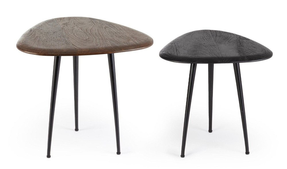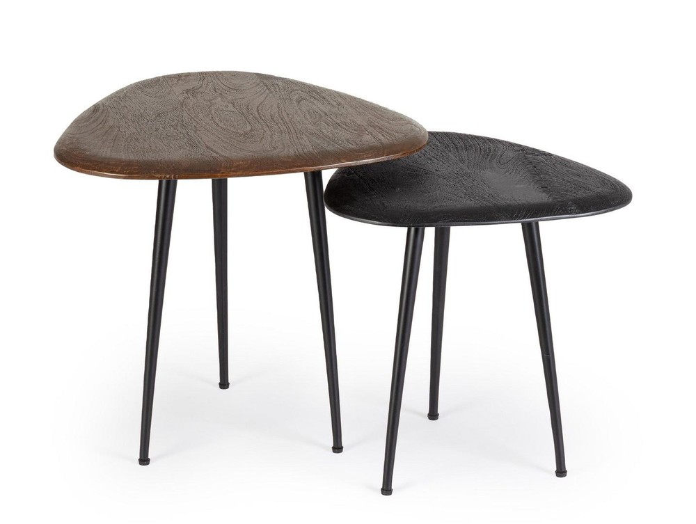 Dieses stilvolle Set aus zwei Couchtischen vereint modernes Design, hochwertige Materialien und durchdachte Handwerkskunst. Die dreieckigen Tischplatten mit abgerundeten Ecken aus Mangoholz verleihen jedem Tisch einen markanten, zugleich eleganten Charakter und schaffen ein dynamisches Raumgefühl. Jede Platte wurde sorgfältig bearbeitet und strahlt natürliche Wärme aus, während die abgerundeten Ecken für ein harmonisches, weiches Erscheinungsbild sorgen. Der größere Tisch überzeugt mit einem natürlichen Finish, das die charakteristische Maserung des Mangoholzes besonders zur Geltung bringt, während der kleinere Tisch mit einem schwarzen Finish einen modernen, kontrastreichen Akzent setzt. Beide Tischplatten wurden mit einer Nitrocellulose-Feinbearbeitung veredelt, die für eine glatte, langlebige und pflegeleichte Oberfläche sorgt. Die stabilen Beine aus Stahl mit schwarzem Finish und epoxidischer Pulverbeschichtung garantieren nicht nur Standfestigkeit, sondern verleihen den Tischen einen klaren, modernen Look, der die natürliche Eleganz des Holzes optimal ergänzt. Mit den Maßen von ca. 50 x 50 x 50 cm für den großen Tisch und ca. 40 x 40 x 40 cm für den kleinen Tisch können die beiden Tische flexibel arrangiert werden – entweder als ineinandergestelltes Ensemble oder separat im Raum verteilt. Die Kombination aus unterschiedlichen Größen und kontrastierenden Oberflächen macht das Set zu einem vielseitigen Highlight für Wohnzimmer, Lounge oder Wartebereiche. Dieses Set vereint natürliche Materialien, modernes Design und handwerkliche Qualität – perfekt für alle, die Stil, Flexibilität und Funktionalität in einem Möbelstück suchen.