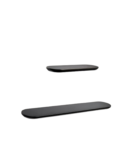 Dieses moderne Set aus zwei Regalen in unterschiedlichen Größen überzeugt durch eine klare Formensprache, hochwertige Materialien und vielseitige Einsatzmöglichkeiten. Gefertigt aus robustem MDF und kombiniert mit rostfreiem Stahl, bieten die Regale eine stabile und langlebige Basis für stilvolle Wandgestaltung. Die schwarz lackierte Oberfläche verleiht dem Set eine elegante, zeitlose Ausstrahlung und fügt sich mühelos in moderne, industrielle oder minimalistische Wohnkonzepte ein. Die schlanke Bauweise unterstreicht das reduzierte Design und lässt die Regale besonders leicht und unaufdringlich wirken. Gleichzeitig bieten sie ausreichend Platz für Bücher, Bilderrahmen, kleine Pflanzen oder dekorative Accessoires. Durch die unterschiedlichen Größen eröffnen sich flexible Gestaltungsmöglichkeiten – ob symmetrisch angeordnet, versetzt montiert oder einzeln eingesetzt. Das große Regal mit den Maßen von ca. 55 × 1,5 × 10 cm (Breite × Höhe × Tiefe) eignet sich ideal als Präsentationsfläche für längere Objekte oder mehrere Dekorationselemente. Das kleine Regal mit ca. 30 × 1,5 × 10 cm ergänzt das Set perfekt und setzt gezielte Akzente an der Wand. Ob im Wohnzimmer, Arbeitszimmer, Flur oder Schlafzimmer – dieses Regal-Set verbindet funktionale Ablageflächen mit modernem Design. Eine stilvolle Lösung für alle, die Ordnung schaffen und gleichzeitig ihre Wände bewusst und hochwertig gestalten möchten.