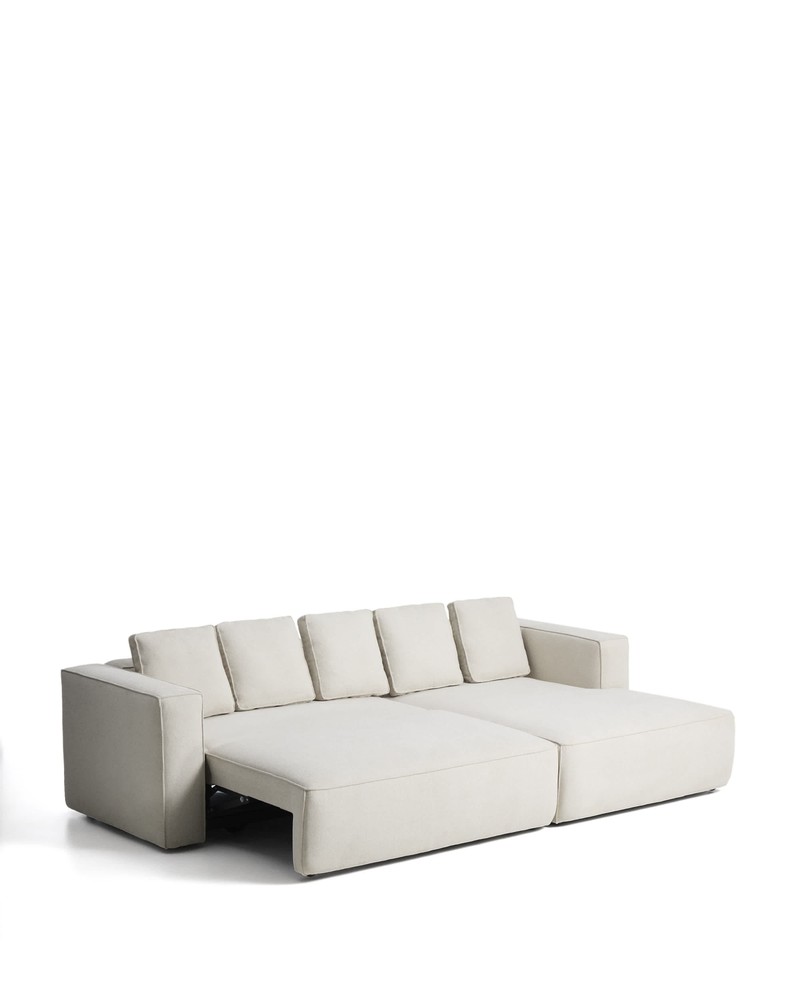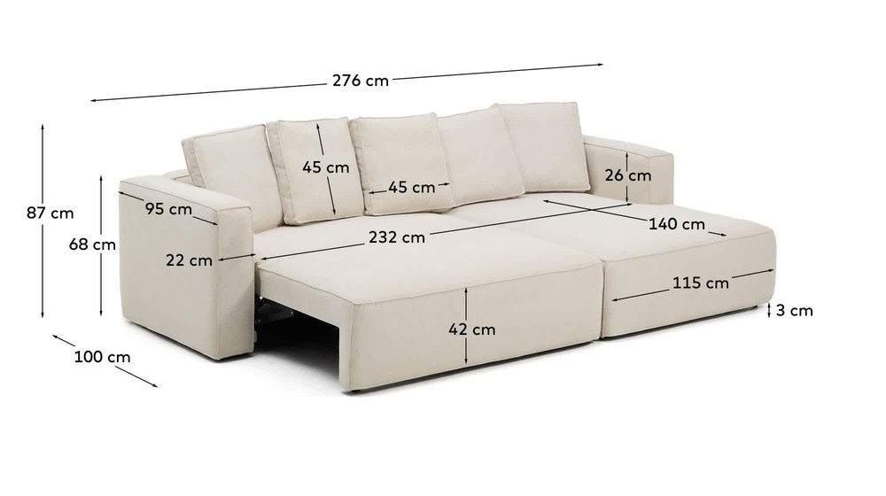 Dieses 3-Sitzer-Bettsofa mit Chaiselounge auf der rechten Seite verbindet modernes Design, durchdachte Funktionalität und hohen Komfort in einem stilvollen Möbelstück. Es ist die ideale Lösung für alle, die Wohnlichkeit und Flexibilität in einem Sofa suchen, denn es lässt sich mühelos vom gemütlichen Sitzmöbel in ein komfortables Gästebett verwandeln. Der Bezug aus fein strukturiertem Chenille-Stoff in Beige überzeugt durch seinen weichen, samtigen Griff und das schmutzabweisende Finish, das das Sofa besonders pflegeleicht macht. Dadurch bleibt es auch bei täglicher Nutzung lange ansprechend und einladend. Die mittelfeste Sitzfläche entsteht durch die Kombination aus Schaumstoffpolsterung mittlerer Dichte und dem integrierten Federungssystem, das für eine ausgewogene Unterstützung sorgt. So bietet das Sofa ein komfortables, zugleich stabil abgestütztes Sitzgefühl – ideal für lange Fernsehabende, entspannte Stunden mit Familie oder Gästeempfänge. Fünf abziehbare Rückenkissen, gefüllt mit silikonisierten Fasern und zerkleinertem Schaumstoff, ergänzen den Komfort und lassen sich nach Wunsch arrangieren. Sie bieten einen weichen, stützenden Rückenkomfort und verleihen dem Sofa ein besonders wohnliches, einladendes Erscheinungsbild. Die Kissen sind inklusive und runden das Gesamtpaket ab. Ein besonderes Highlight ist das Y-open-System: Dank des synchronisierten Öffnungsmechanismus lässt sich das Sofa leicht in ein komfortables Bett von 140 × 232 cm ausklappen. So wird das Sofa im Handumdrehen zu einer großzügigen Schlafgelegenheit für Gäste oder zu einem entspannten Rückzugsort für gemütliche Stunden. Mit seinen Maßen von ca. 276 × 87 × 172,5 cm (Breite × Höhe × Tiefe) bietet das Sofa großzügigen Platz zum Sitzen, Liegen und Relaxen. Die Chaiselounge auf der rechten Seite sorgt zusätzlich für Komfort beim Ausstrecken der Beine und setzt gleichzeitig ein stilvolles, modernes Statement im Raum. Dieses 3-Sitzer-Bettsofa kombiniert hochwertige Materialien, komfortable Polsterung, flexible Nutzungsmöglichkeiten und zeitloses Design in einem Möbelstück.