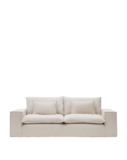 Modern, schick, außergewöhnlich. Dieses trendige Sofa ist ein toller Blickfang für Ihr Zuhause. Dieses beige 3-Sitzer-Sofa, mit abnehmbarem Bezug aus Naturstoff mit Leinen, Silikon-Mikrofaser-Füllung mit Daunen-Effekt, die für ein besonders weiches und geschmeidiges Sitzgefühl sorgt und quadratische Armlehnen, vereint Funktionalität, Komfort und Design. Es ist das perfekte Gleichgewicht zwischen Komfort und Zweckmäßigkeit. Sowohl Sitz- als auch Rückenlehnen Bezüge sind abnehmbar, Kissen sind inbegriffen. Zudem bietet die Sitzgarnitur Platz für bis zu drei Personen.