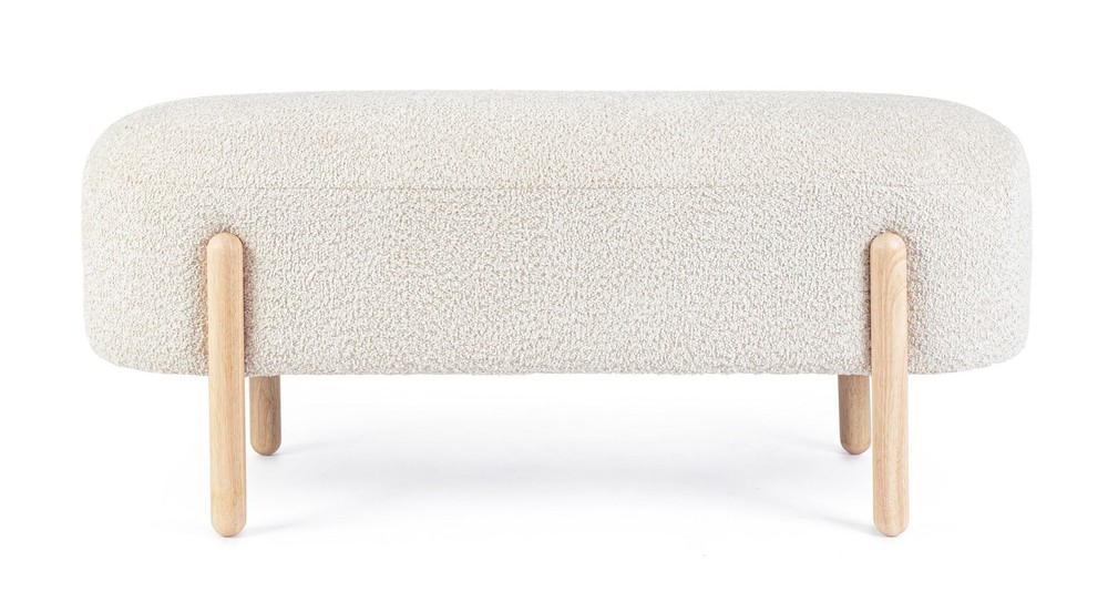 Diese stilvolle Bank vereint modernes Design mit behaglichem Komfort und natürlichen Materialien. Der stabile Korpus aus MDF und Sperrholz bildet die solide Basis, während die weiche Polsterung aus hochwertigem Polyurethanschaum für ein angenehmes Sitzgefühl sorgt. Bezogen ist die Sitzfläche mit einem eleganten Polyesterstoff in edler Bouclé-Optik – in einem sanften Beigeton, der Wärme und Ruhe ausstrahlt und sich harmonisch in verschiedenste Einrichtungsstile einfügt. Die charakteristische, leicht strukturierte Oberfläche des Bouclé-Stoffs verleiht der Bank einen modernen und zugleich gemütlichen Look. Sie bringt eine subtile Textur ins Wohnambiente und sorgt für das gewisse Etwas – perfekt, um jedem Raum eine stilvolle, wohnliche Note zu verleihen. Getragen wird die Bank von robusten Beinen aus Kautschukholz mit natürlichem Finish. Das helle Holz harmoniert wunderbar mit dem beigen Bezug und betont den skandinavisch inspirierten Charakter des Designs. Diese Kombination aus warmen, natürlichen Materialien und klarer Formgebung macht die Bank zu einem vielseitig einsetzbaren Möbelstück – ideal als Sitzgelegenheit im Eingangsbereich, am Esstisch, vor dem Bett oder als dekoratives Statement im Wohnzimmer.