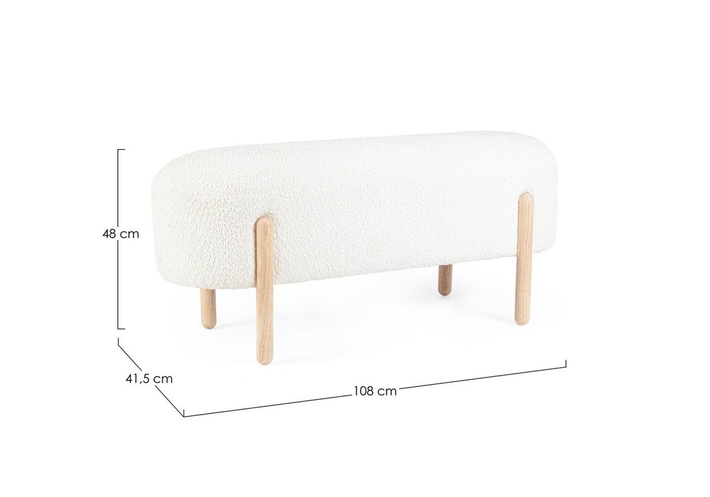Diese wunderschöne Bank vereint modernes Design, wohnliche Wärme und höchsten Komfort. Der solide Korpus aus MDF und Sperrholz sorgt für Stabilität und Langlebigkeit, während die weiche Polsterung aus formbeständigem Polyurethanschaum für angenehmen Sitzkomfort sorgt. Bezogen ist die Sitzfläche mit einem hochwertigen Polyesterstoff in edler Bouclé-Optik, dessen strukturierte Oberfläche dem Möbelstück eine besonders gemütliche und zugleich elegante Ausstrahlung verleiht. Das sanfte Weiß des Bezugs bringt Helligkeit und Leichtigkeit in jeden Raum und lässt sich vielseitig kombinieren. Die Beine aus massivem Kautschukholz mit natürlichem Finish bilden einen harmonischen Kontrast zum hellen Stoff und unterstreichen den modernen, skandinavisch inspirierten Stil der Bank. Die natürliche Holzmaserung verleiht jedem Stück eine individuelle Note und sorgt für ein warmes, wohnliches Ambiente. Ob im Eingangsbereich, im Schlafzimmer am Fußende des Bettes, im Wohnzimmer als zusätzliche Sitzgelegenheit oder im Ankleidezimmer – diese Bank fügt sich mühelos in verschiedenste Wohnstile ein. Sie ist sowohl funktional als auch ästhetisch ein echtes Highlight und lädt zum Verweilen ein.