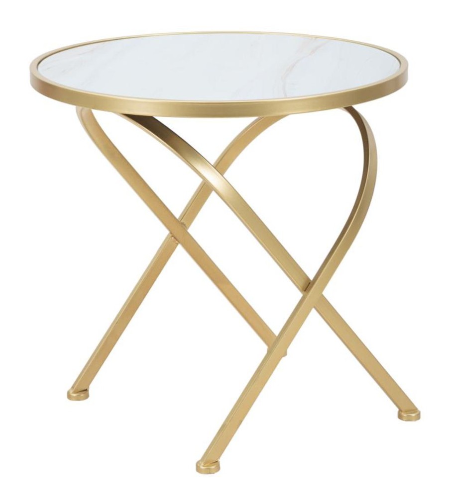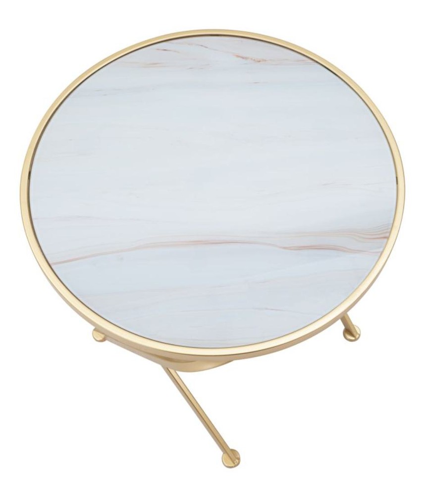 Ein kleiner Beistelltisch, der auf den ersten Blick als Ruhepol im Raum wirkt und bei genauerem Hinsehen seine entschiedene Persönlichkeit offenbart. Ein filigraner Rahmen aus goldenem Metall, der das Licht sanft einfängt, trägt eine makellose Platte. Kühle, lebendige Maserungen treffen auf warmen Metallglanz. Die klaren, geometrischen Linien des Designs sind bewusst reduziert, doch gerade darin liegt seine Stärke.