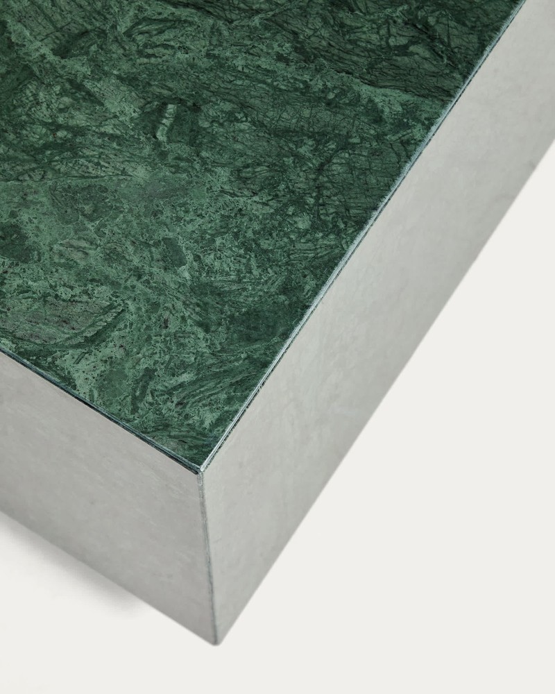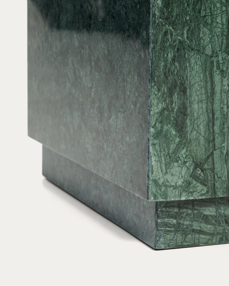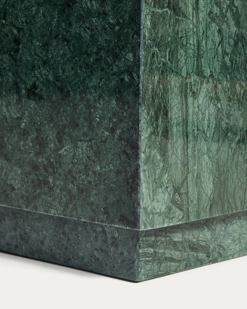 Dieser elegante Beistelltisch aus MDF und massiven Marmorplatten in sattem Grün vereint luxuriöse Materialien mit durchdachtem, modernem Design und wird zu einem stilvollen Akzent in Ihrem Zuhause. Die 15 mm dicken Marmorplatten bilden die Tischoberfläche und die Seitenflächen und bestechen durch ihre natürliche Farbvariation und charakteristische Aderung, die jedes Stück zu einem einzigartigen Unikat machen. So entsteht ein Möbelstück, das nicht nur funktional, sondern auch ein dekoratives Statement ist. Der Tisch ist quadratisch gestaltet und besitzt eine innen hohle Konstruktion, die das Gewicht reduziert und den Transport erheblich erleichtert, ohne die Stabilität oder Qualität zu beeinträchtigen. Ein Kunststoffschutz am unteren Bereich sorgt dafür, dass Ihr Boden vor Kratzern geschützt bleibt, selbst wenn der Tisch bewegt wird. Mit seinen kompakten Maßen von ca. 40 x 40 x 35 cm (Länge x Breite x Höhe) eignet sich der Beistelltisch ideal als praktische Ablage neben Sofa, Sessel oder Bett. Gleichzeitig zieht er durch seine edle Materialität und die leuchtend grünen Marmornuancen alle Blicke auf sich. Dieses Möbelstück ist nicht nur funktional, sondern ein echtes Designobjekt, das mit seinen natürlichen Farbspielen, der hochwertigen Verarbeitung und der harmonischen Form jedem Raum eine elegante und exklusive Note verleiht. Ein Beistelltisch, der Luxus, Alltagstauglichkeit und individuelle Schönheit perfekt miteinander vereint.