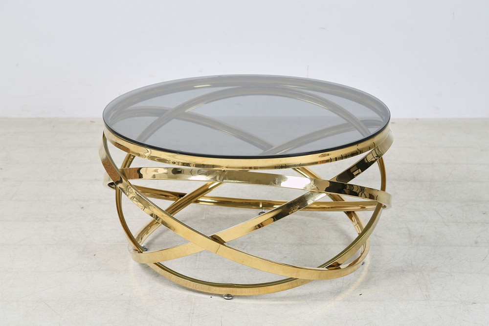 Ein kleiner Hingucker in ihrem Wohnbereich. Dieser kleine Couchtisch überzeugt mit seinem modernen Design. Seine runde Tischplatte ist aus robustem Sicherheitsglas in Grau. Das macht sie stabil und pflegeleicht. Das Highlight an diesem Stück ist sein Metallgestell. Aus rostfreiem Edelstahl punktet dieses Exemplar mit seinem besonderen Design in Gold. Das passt super in einen modernen Einrichtungsstil und komplementiert ihre restlichen Möbel im Wohnbereich. Seine Größe von 80 x 80 cm macht den Tisch vielseitig einsetzbar, dabei ist ihrer Kreativität keiner Grenze gesetzt.