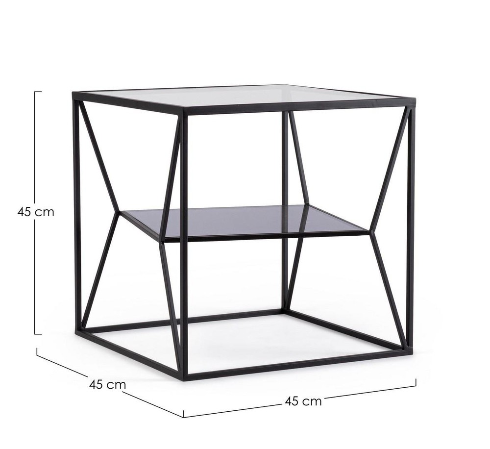 Verleihen Sie Ihrem Wohnraum einen Hauch moderner Eleganz mit diesem stilvollen Couchtisch, der Design und Funktionalität in perfekter Balance vereint. Das robuste Gestell aus hochwertigem Stahl überzeugt durch ein schwarzes, epoxidisch pulverbeschichtetes Finish – kratzfest, langlebig und mit einer dezenten, matten Oberfläche, die sich nahtlos in moderne wie klassische Einrichtungskonzepte einfügt. Das klare Highlight dieses Tisches sind die beiden Flächen aus ausgespanntem Glas – die obere Tischplatte und die zentral darunterliegende Ablage. Das transparente Glas sorgt für eine offene, luftige Optik und schafft gleichzeitig praktische Abstellmöglichkeiten für Zeitschriften, Fernbedienungen oder Dekoelemente. Dank der durchdachten Konstruktion bleibt der Tisch trotz seiner kompakten Maße ein echter Blickfang in jedem Raum. Mit seinen handlichen Abmessungen von ca. 45 x 45 x 45 cm (Länge x Breite x Höhe) eignet sich dieser Tisch ideal für kleinere Wohnbereiche, als Beistelltisch neben dem Sofa oder als stilvolle Ergänzung zu Ihrer Sitzecke.