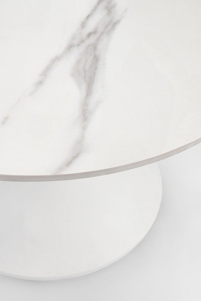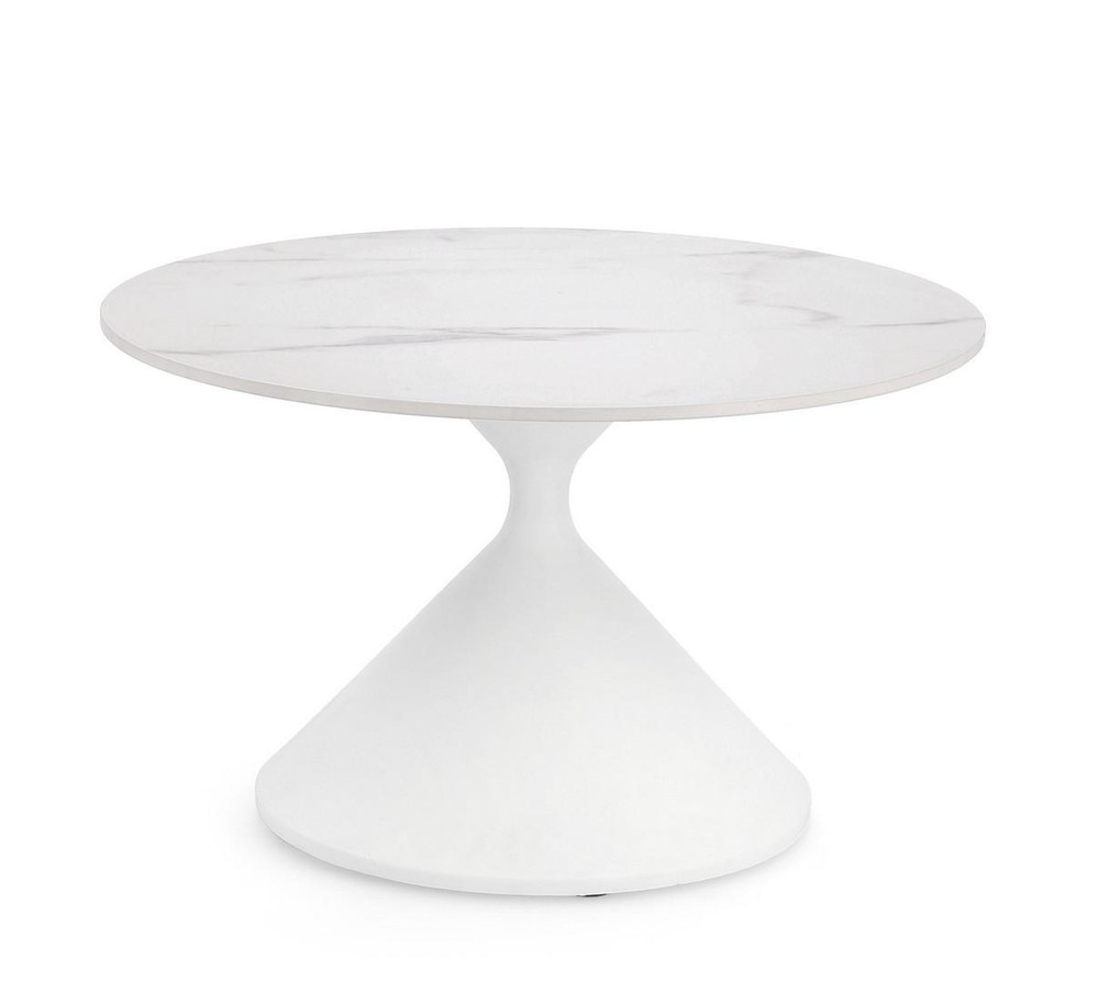 Dieser stilvolle Couchtisch vereint minimalistisches Design mit hochwertigen Materialien und bringt eine helle, moderne Note in jedes Wohnambiente. Die runde Tischplatte aus Feinsteinzeug besticht durch ihre matte, weiße Marmor-Optik, die natürliche Strukturen und elegante Farbnuancen harmonisch miteinander verbindet. Das Ergebnis ist ein zeitloses Möbelstück, das gleichzeitig luxuriös und dezent wirkt. Tragendes Element ist der Standfuß aus Stahl, der mit einer epoxidpulverbeschichteten Oberfläche in Weiß versehen ist. Diese Pulverbeschichtung sorgt für hervorragende Widerstandsfähigkeit, schützt vor Kratzern und Korrosion und verleiht dem Tisch einen eleganten, gleichmäßigen Look. Das Zusammenspiel von robustem Stahl und edlem Feinsteinzeug schafft einen modernen Kontrast, der Leichtigkeit und Stabilität perfekt vereint. Die runde Form der Tischplatte fügt sich harmonisch in verschiedene Einrichtungsstile ein – ideal für Wohn- und Loungbereiche, kleinere Sofaecken oder als Beistelltisch neben Sesseln. Mit den Maßen von ca. 70 x 70 x 40 cm (L x B x H) bietet der Tisch ausreichend Fläche für Dekoration, Bücher oder Getränke, ohne den Raum zu überladen.
