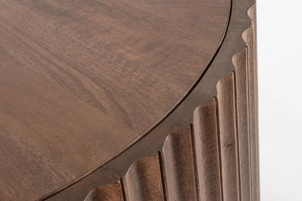 Dieser runde Couchtisch ist ein elegantes Statement für alle, die zeitloses Design, natürliche Materialien und feine Handwerkskunst zu schätzen wissen. Gefertigt aus Mangoholz mit einem warmen, natürlichen Finish, überzeugt der Tisch durch seine organische Ausstrahlung, hochwertige Verarbeitung und ein raffiniertes Detail: den stilvoll gerillten Holzsockel, der ihm eine skulpturale Leichtigkeit und moderne Präsenz verleiht. Die Tischplatte besteht aus solidem Mangoholz – einem langlebigen, robusten Naturmaterial, das für seine ausdrucksstarke Maserung und warme Farbnuancen bekannt ist. Das natürliche Finish bringt die individuelle Holzstruktur besonders schön zur Geltung, während die Oberfläche mit einer nitrocellulose-basierten Beschichtung veredelt wurde. Diese schützt das Holz zuverlässig vor Alltagsbeanspruchung, ohne den natürlichen Look und die angenehme Haptik zu beeinträchtigen. Das Ergebnis ist eine samtig-matte Oberfläche, die sowohl pflegeleicht als auch ästhetisch ansprechend ist. Das Design-Highlight des Tisches ist der runde Sockel aus gerilltem Mangoholz, der dem Möbelstück Tiefe, Struktur und Charakter verleiht. Die vertikal verlaufenden Rillen fangen das Licht je nach Blickwinkel auf unterschiedliche Weise ein und machen den Tisch zu einem echten Blickfang im Raum – dezent, aber dennoch präsent. Die runde Form des Tisches wirkt einladend und harmonisch und eignet sich perfekt für gemütliche Sitzgruppen, Sofalandschaften oder als zentrales Element in modernen Wohnbereichen. Mit einem Durchmesser von 80 cm und einer Höhe von 45 cm ist der Couchtisch ideal proportioniert – großzügig genug für Bücher, Dekoration oder ein Tablett mit Getränken, dabei kompakt und leicht kombinierbar mit verschiedenen Sofa- und Sesseltypen.