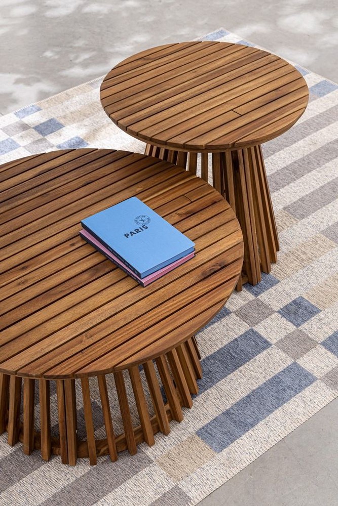 Dieser stilvolle Couchtisch aus massivem Akazienholz vereint natürliche Eleganz mit modernem Design und wird so zum zentralen Blickfang in Ihrem Wohnbereich. Das warme, geölte Finish unterstreicht die natürliche Maserung des Holzes, hebt seine lebendige Struktur hervor und sorgt gleichzeitig für eine pflegeleichte, langlebige Oberfläche. Jede Tischplatte ist damit ein individuelles Unikat, das zeitlose Schönheit und Handwerkskunst vereint. Das offene Gestell des Tisches ist kegelförmig gestaltet und besteht aus filigranen Lamellen, die der Konstruktion Stabilität verleihen und gleichzeitig eine luftige, leichte Optik schaffen. Auch die runde Tischplatte greift dieses Lamellenmotiv auf und sorgt für eine harmonische, fließende Formensprache. Diese Kombination aus geometrischer Struktur und organischem Holzdesign macht den Tisch zu einem eleganten Möbelstück, das sowohl funktional als auch dekorativ überzeugt. Mit den Maßen von ca. 70 x 70 x 40 cm (Länge x Breite x Höhe) bietet der Tisch großzügige Ablagefläche für Bücher, Dekoration oder Getränke, ohne dabei zu wuchtig zu wirken. Er lässt sich flexibel in verschiedenen Wohnsituationen platzieren – sei es als zentrales Element im Wohnzimmer, als stilvoller Beistelltisch neben einem Sofa oder als dekorativer Akzent in modernen Loft- oder Apartmentkonzepten. Die Kombination aus hochwertigem Akazienholz, präziser Verarbeitung und durchdachtem Lamellen-Design macht diesen Couchtisch zu einem langlebigen Möbelstück, das natürlichen Charme, moderne Ästhetik und praktische Funktionalität perfekt vereint. Ein Möbelstück, das jedem Raum Wärme, Charakter und Stil verleiht.