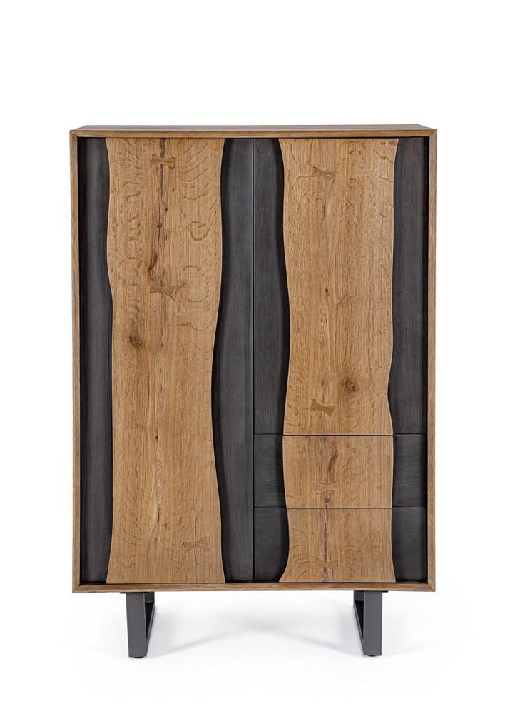 Dieses elegante Highboard vereint modernes Design, natürliche Materialien und durchdachte Funktionalität zu einem stilvollen Möbelstück für anspruchsvolle Wohnkonzepte. Mit seiner klaren Formensprache, den kontrastierenden Oberflächen und der hochwertigen Verarbeitung wird es zum zeitlosen Highlight in Wohn-, Ess- oder Arbeitsbereichen. Gefertigt aus MDF mit edlem Eichenfurnier überzeugt das Highboard durch seine warme, natürliche Ausstrahlung und eine fein strukturierte Oberfläche, die die authentische Maserung des Holzes zur Geltung bringt. Ergänzt wird das Design durch robuste Stahlelemente, die dem Möbelstück eine moderne, industrielle Note verleihen und gleichzeitig für Stabilität und Langlebigkeit sorgen. Das Highboard ist in einer geschmackvollen Farbkombination aus Schwarz und Naturholz gestaltet – ein harmonisches Zusammenspiel, das Eleganz und Modernität vereint. Es verfügt über zwei Türen und zwei Schubladen, die großzügigen Stauraum für diverse Gegenstände bieten. Die Soft-Close-Funktion sorgt für ein leises, sanftes Schließen und unterstreicht den hohen Qualitätsanspruch des Designs. Mit seinen kompakten Maßen von ca. 42 x 120 x 80 cm (B x H x T) fügt sich das Highboard harmonisch in unterschiedlichste Raumkonzepte ein – ob als stilvolles Einzelstück im Wohnzimmer, als funktionales Sideboard im Essbereich oder als eleganter Stauraum im Büro. Seine ausgewogene Höhe bietet zudem eine ideale Fläche zur dekorativen Präsentation von Vasen, Lampen oder Kunstobjekten.