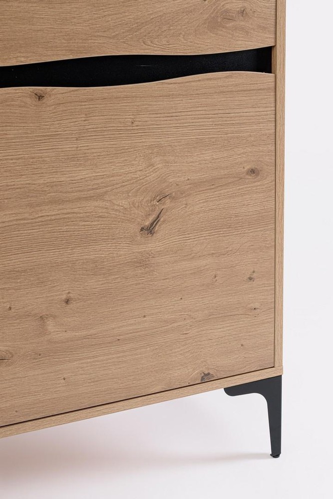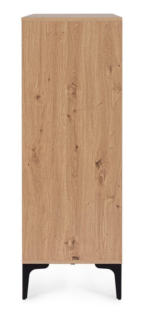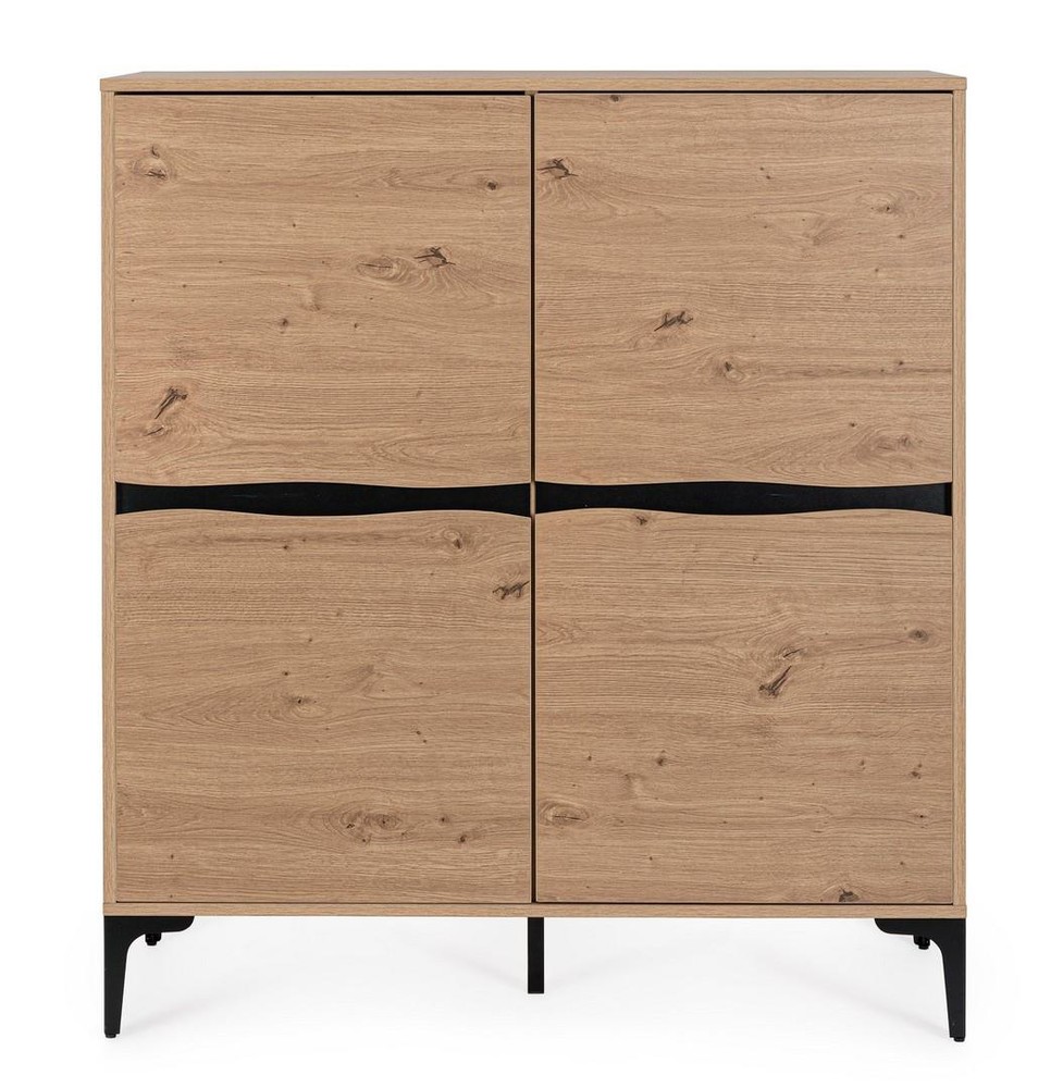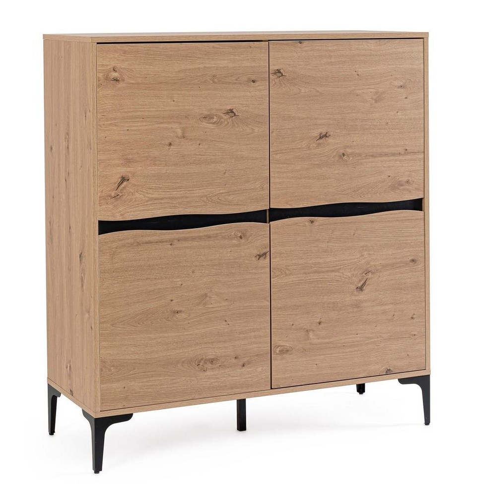 Dieses stilvolle Highboard vereint warme Holzoptik mit modernem Industrial-Design und wird so zu einem echten Highlight in jedem Wohnraum. Der Korpus aus MDF und PB (Pressspan) ist mit einem edlen braun-natürlichen Finish versehen, das die Maserung und Struktur von Holz authentisch widerspiegelt. Das Ergebnis ist ein harmonisches Gesamtbild, das Natürlichkeit und zeitgemäße Formensprache perfekt miteinander verbindet. Für einen modernen Akzent sorgt das elegante Stahldekor in Schwarz, das sich dezent in die Frontgestaltung einfügt und dem Möbelstück eine exklusive, industrielle Note verleiht. Die Beine aus pulverbeschichtetem Stahl in schwarzem Finish unterstreichen den modernen Charakter des Highboards und sorgen zugleich für einen stabilen, langlebigen Stand. Die Pulverbeschichtung schützt das Metall zusätzlich vor Kratzern und Abnutzung – ideal für den Alltag. Mit seinen Maßen von ca. 40 x 115 x 100 cm (B x H x T) bietet das Highboard großzügigen Stauraum, ohne zu viel Platz einzunehmen. Ob im Wohnzimmer, Essbereich oder Flur – dieses Highboard überzeugt durch seine funktionale Vielseitigkeit und seinen ästhetischen Anspruch. Es lässt sich wunderbar mit anderen Möbeln im modernen, skandinavischen oder industriellen Stil kombinieren und bringt Wärme, Struktur und Designbewusstsein in jedes Zuhause.
