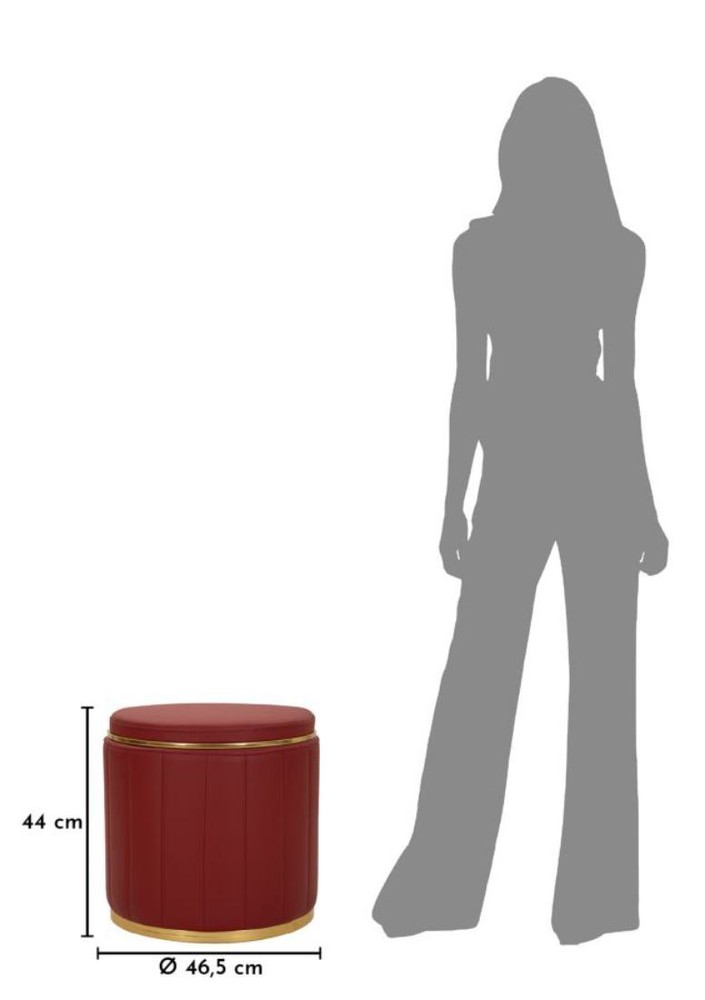 Dieser elegante Hocker vereint hochwertige Materialien, durchdachtes Design und praktische Funktionalität und wird zu einem stilvollen Highlight in Ihrem Zuhause. Die runde Form, kombiniert mit dem satten Bordeaux-Ton und feinen goldfarbenen Akzenten, verleiht dem Möbelstück eine warme, luxuriöse Ausstrahlung. Die Sitzfläche ist mit weichem Polyurethan in Bordeaux bezogen und bietet einen komfortablen, einladenden Sitz. Oben und unten setzen dezente goldfarbene Ringe elegante Akzente, die die kräftige Farbgebung stilvoll auflockern und das Design auf raffinierte Weise abrunden. Besonders praktisch: Die Sitzfläche fungiert gleichzeitig als Deckel und öffnet sich zu einem großzügigen Stauraum. Hier lassen sich Kissen, Decken oder andere Wohnaccessoires ordentlich verstauen, sodass der Hocker Design, Komfort und Funktion in einem Möbelstück vereint. Die stabile Konstruktion aus Pinie und MDF sorgt für Langlebigkeit und Standfestigkeit. Mit seinen Maßen von ca. 46,5 x 44 x 46,5 cm (Breite x Höhe x Tiefe) ist der Hocker kompakt, bietet aber eine großzügige Sitzfläche und vielseitige Einsatzmöglichkeiten – als bequeme Sitzgelegenheit, dekoratives Möbelstück oder praktischer Stauraum. Dieser Hocker verbindet edle Materialien, elegante Details und cleveren Stauraum in einem modernen, runden Möbelstück und wird so zu einem funktionalen und stilvollen Highlight in jedem Raum.