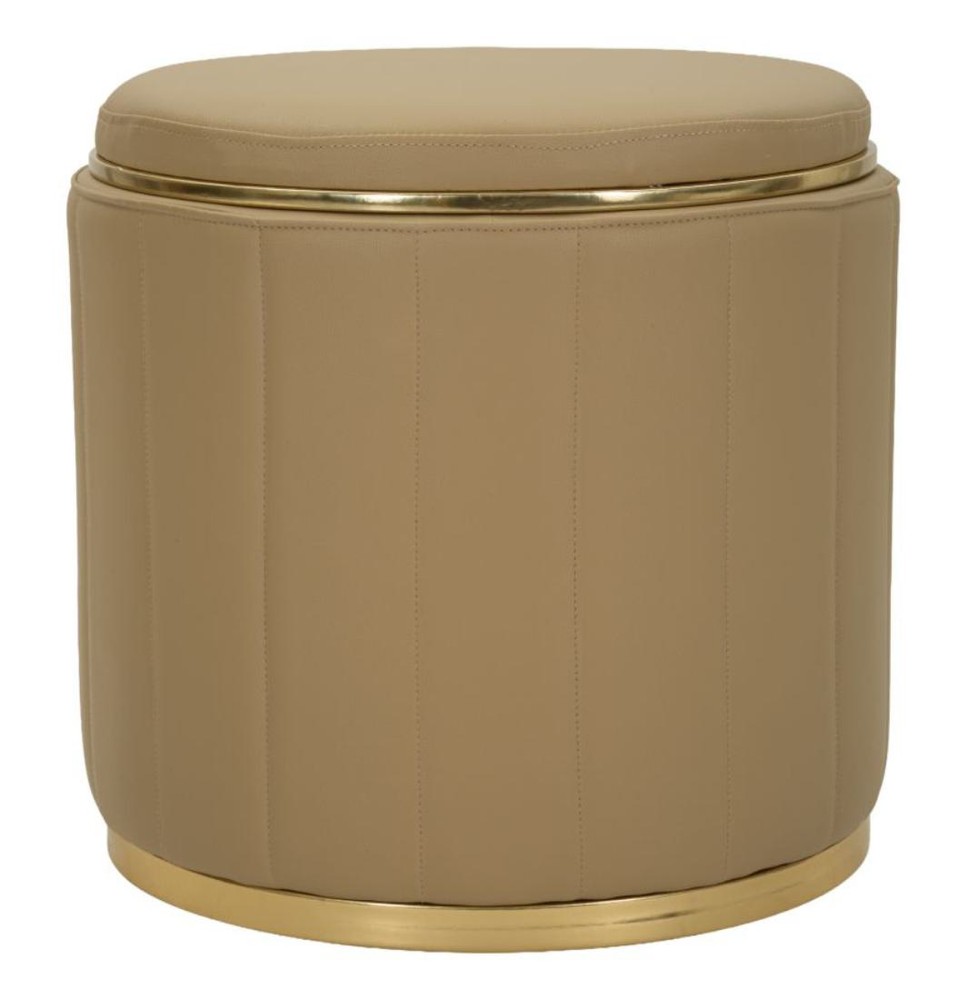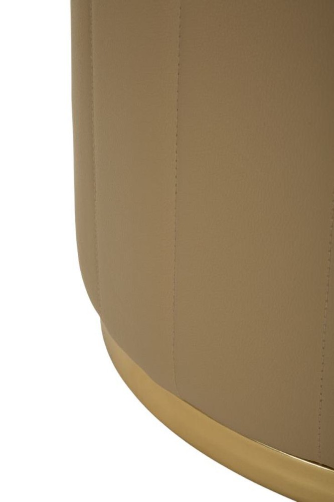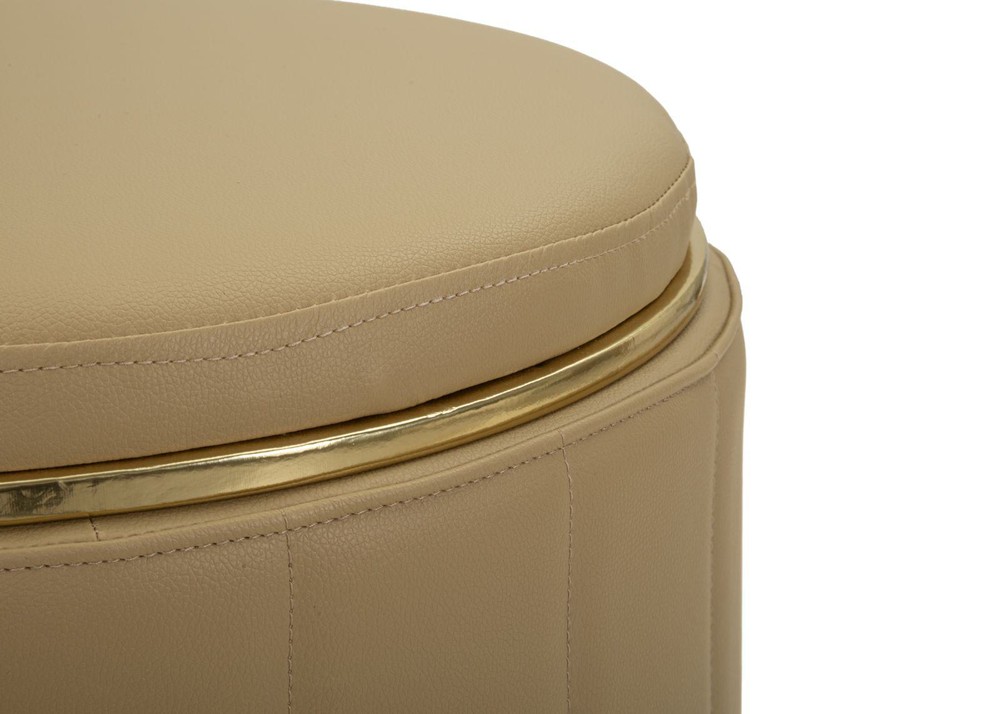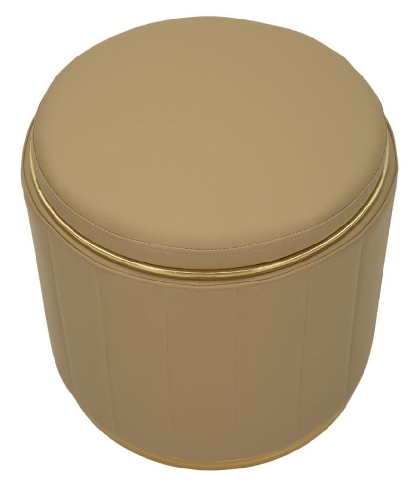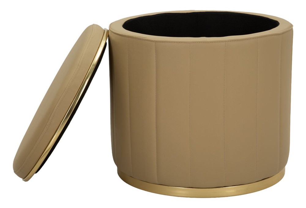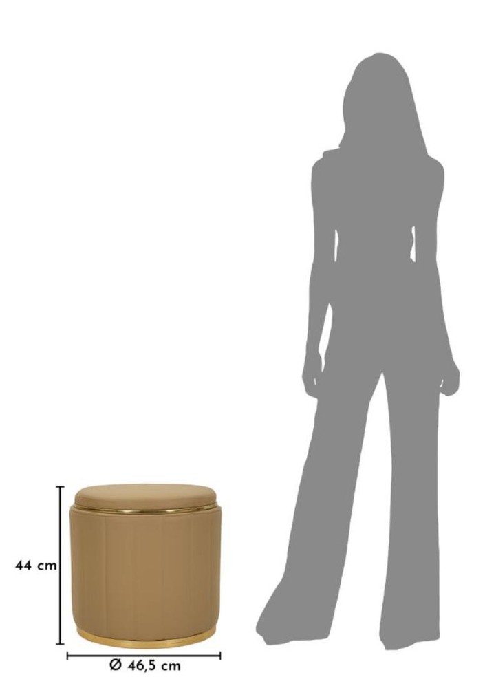Dieser elegante Hocker vereint hochwertige Materialien, durchdachtes Design und praktische Funktionalität und wird zu einem stilvollen Highlight in Ihrem Zuhause. Die runde Form, kombiniert mit warmen Brauntönen und goldfarbenen Akzenten, verleiht dem Möbelstück eine moderne, zugleich luxuriöse Ausstrahlung. Die Sitzfläche ist mit weichem braunem Polyurethan bezogen und bietet einen angenehmen, komfortablen Sitz. Oben und unten ist der Hocker mit dezenten goldfarbenen Ringen veredelt, die einen stilvollen Kontrast zur warmen Farbgebung setzen und das Design auf raffinierte Weise abrunden. Besonders praktisch: Die Sitzfläche fungiert gleichzeitig als Deckel und öffnet sich zu einem großzügigen Stauraum. Hier lassen sich Kissen, Decken oder andere Wohnaccessoires ordentlich verstauen, sodass der Hocker Design, Komfort und Funktion auf elegante Weise vereint. Die stabile Konstruktion aus Pinie und MDF sorgt für Langlebigkeit und Standfestigkeit. Mit seinen Maßen von ca. 46,5 x 44 x 46,5 cm (Breite x Höhe x Tiefe) ist der Hocker kompakt, aber großzügig dimensioniert, sodass er sowohl als Sitzgelegenheit, dekoratives Möbelstück als auch als funktionaler Stauraum genutzt werden kann. Dieser Hocker vereint edle Materialien, raffinierte Details und praktischen Stauraum in einem modernen, runden Möbelstück und wird so zu einem eleganten, funktionalen Highlight in jedem Wohnbereich.
