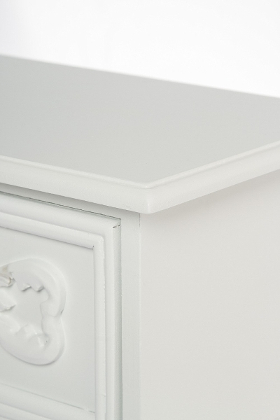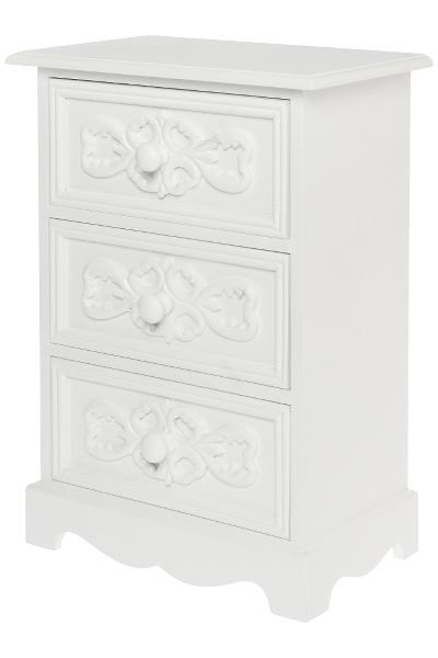 Die Mini Kommode Nina ist aus MDF und Weiß. Sie hat 3 Schubladen mit geschnitzten Ornamenten, so daß ein romantischer Landhausstil entsteht. Zusätzlich bieten die geschwungenen Formen ein abgerundetes Bild in ihrem Zuhause.