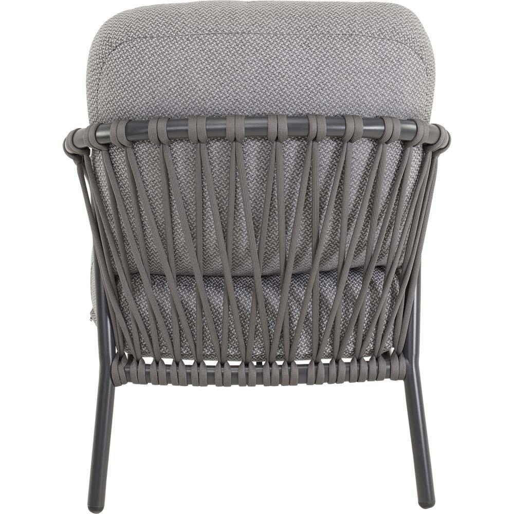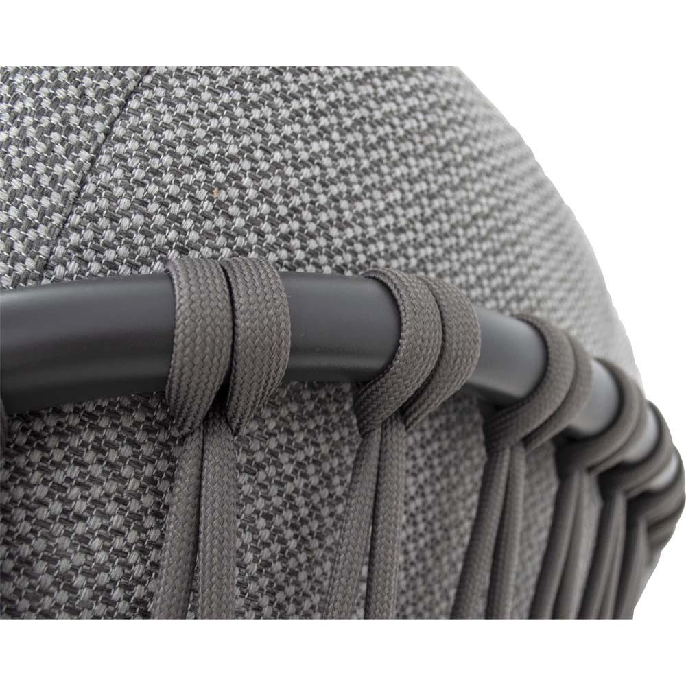 Die Bespannung aus 18 × 9 mm Seil in Dunkelgrau setzt einen stilvollen Akzent und bietet zugleich angenehme Flexibilität. Ergänzt wird der Sitzkomfort durch ein hochwertiges Olefinkissen mit 300 g/m², das strapazierfähig und komfortabel gepolstert ist. Ideal für Lounge-, Terrassen- oder Gartenbereiche – ein stilvoller Stuhl für entspannte Momente.