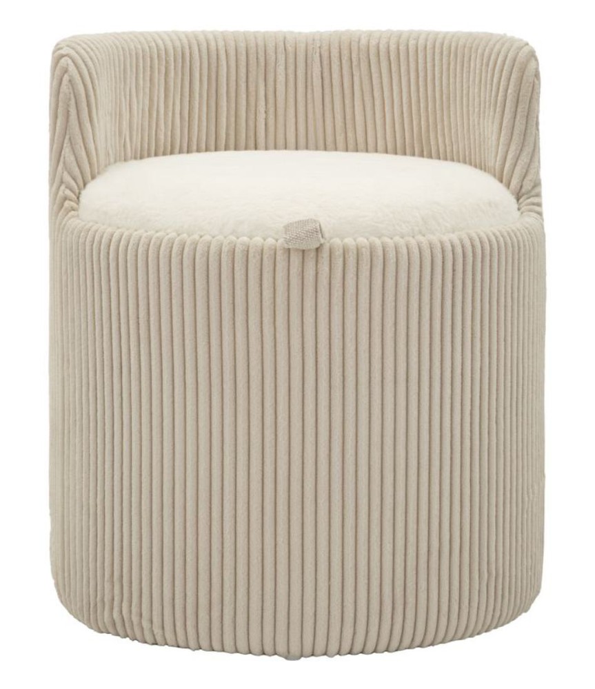 Dieser moderne Polsterstuhl vereint Komfort, praktisches Design und stilvolle Eleganz und wird zu einem vielseitigen Highlight in Ihrem Wohnraum. Die runde Form und die kompakte Größe machen ihn zu einem harmonischen Möbelstück, das sowohl als Sitzgelegenheit als auch als dekoratives Element überzeugt. Der Stuhl ist mit weißem Polyester bezogen, das angenehm weich ist und für eine flauschige Haptik sorgt. Die Seiten sind mit senkrechten Rillen strukturiert, die dem Design eine elegante Tiefe und raffinierte Struktur verleihen. Die kurze Rückenlehne unterstützt ein komfortables Sitzen, ohne die leichte, moderne Erscheinung des Stuhls zu unterbrechen. Besonders durchdacht: Die runde Sitzfläche dient gleichzeitig als Deckel und öffnet sich zu einem praktischen Stauraum, der sich ideal für Decken, Kissen oder andere Wohnaccessoires eignet. Ein integrierter Griff erleichtert das Öffnen des Deckels, sodass der Stauraum jederzeit schnell zugänglich ist. Mit seinen Maßen von ca. 47 x 53 x 47 cm (Breite x Höhe x Tiefe) bietet der Polsterstuhl eine kompakte, aber komfortable Sitzfläche, die sich flexibel im Wohnzimmer, Schlafzimmer, Flur oder Home-Office einsetzen lässt. Dieser Polsterstuhl verbindet modernes Design, strukturierte Details, flauschigen Sitzkomfort und funktionalen Stauraum in einem eleganten Möbelstück. So wird er zu einem stilvollen und praktischen Highlight, das Wohnräume auf ästhetische und funktionale Weise bereichert.