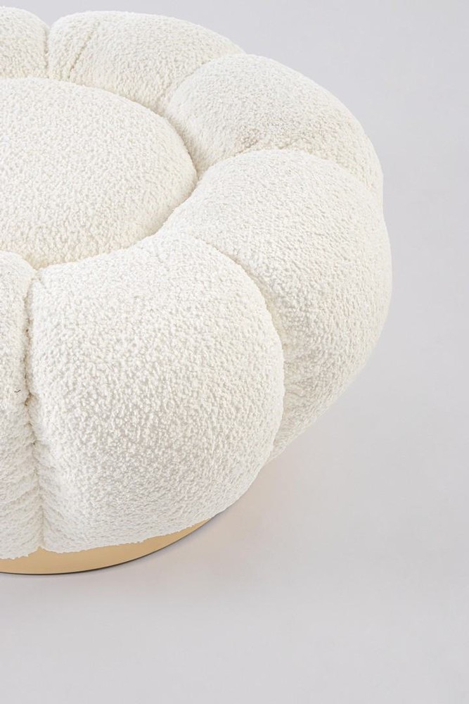 Dieser außergewöhnliche Pouf vereint verspielte Formgebung mit edlen Materialien und wird im Handumdrehen zum stilvollen Highlight in jedem Wohnraum. Das charakteristische Design in Form einer zarten Blume verleiht ihm eine charmante, feminine Ausstrahlung und macht ihn zu einem echten Blickfang – ob im Wohnzimmer, Schlafzimmer oder Ankleidebereich. Das stabile Gestell aus MDF und Sperrholz sorgt für eine solide Basis und hohe Formbeständigkeit. Die komfortable Polsterung aus formstabilem Polyurethanschaum bietet ein angenehmes Sitzgefühl und lädt zum Entspannen ein. Der Bezug aus hochwertigem Polyester präsentiert sich in trendiger Bouclé-Optik in edlem Weiß – ein Material, das durch seine weiche Haptik und lebendige Struktur Wärme und Gemütlichkeit ausstrahlt. Ein besonderer Blickfang ist der dekorative Metallring am Boden, gefertigt aus goldfarbenem Stahl, der dem Pouf einen Hauch von Glamour verleiht und das Design stilvoll abrundet. Durch diese Kombination aus hellem Stoff und goldenem Akzent entsteht ein harmonisches Gesamtbild, das moderne Eleganz mit wohnlicher Behaglichkeit verbindet. Mit seinen kompakten Maßen von ca. 65 x 35 x 65 cm (B x H x T) ist der Pouf vielseitig einsetzbar: als zusätzliche Sitzgelegenheit, als bequeme Fußablage oder als dekoratives Statement-Piece.