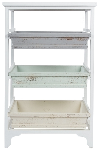 Das Regal Ordwin ist aus Holz und in Farbe Weiß Antik. Es hat drei herausnehmbare Fächer in verschiedenen Farben. Ein dekoratives und praktisches Highlight in Shabby Chic Look für ihr Zuhause.