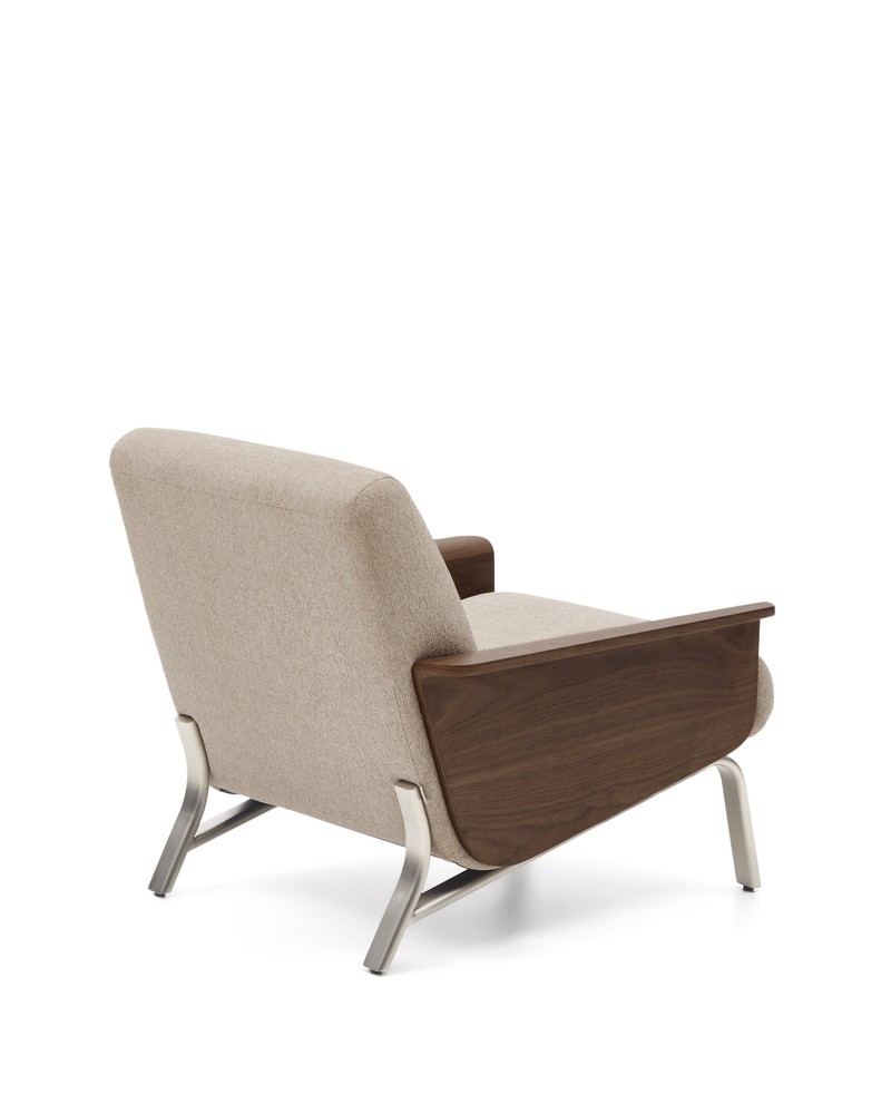 Dieser stilvolle Sessel vereint modernes Design, hochwertige Materialien und außergewöhnlichen Sitzkomfort – ein echtes Highlight für Ihr Wohnzimmer, Büro oder jeden gemütlichen Leseplatz. Die klare, elegante Linie des Sessels wird durch die schlanken Beine aus gebürstetem Stahl unterstrichen, die dem Möbelstück Stabilität verleihen und gleichzeitig einen leichten, modernen Look schaffen. Die Struktur und die Armlehnen bestehen aus robustem Sperrholz, das für Langlebigkeit und Formbeständigkeit sorgt. Besonders edel wirkt die Nussbaumoptik der Armlehnen, die warme Holztöne ins Interieur bringt und den modernen Charakter des Sessels auf harmonische Weise ergänzt. Der Sitz ist mit formstabilem Polyurethanschaum gepolstert, der für angenehme Festigkeit sorgt und gleichzeitig höchsten Komfort beim Sitzen bietet. Der Bezug aus weichem Chenille in elegantem Beige rundet das Design perfekt ab. Das samtartige Material fühlt sich angenehm an und verleiht dem Sessel eine luxuriöse Note, während die dezente Farbgebung vielseitige Kombinationsmöglichkeiten mit unterschiedlichen Einrichtungsstilen ermöglicht – von modern und skandinavisch bis hin zu klassisch oder naturinspiriert. Mit den großzügigen Maßen von ca. 83 × 77 × 86 cm (Breite × Höhe × Tiefe) bietet der Sessel ausreichend Platz, um entspannt zu sitzen oder sich gemütlich zurückzulehnen. Er ist nicht nur ein funktionales Möbelstück, sondern auch ein stilvolles Wohnaccessoire, das Ihrem Raum Komfort, Eleganz und ein warmes Ambiente verleiht.