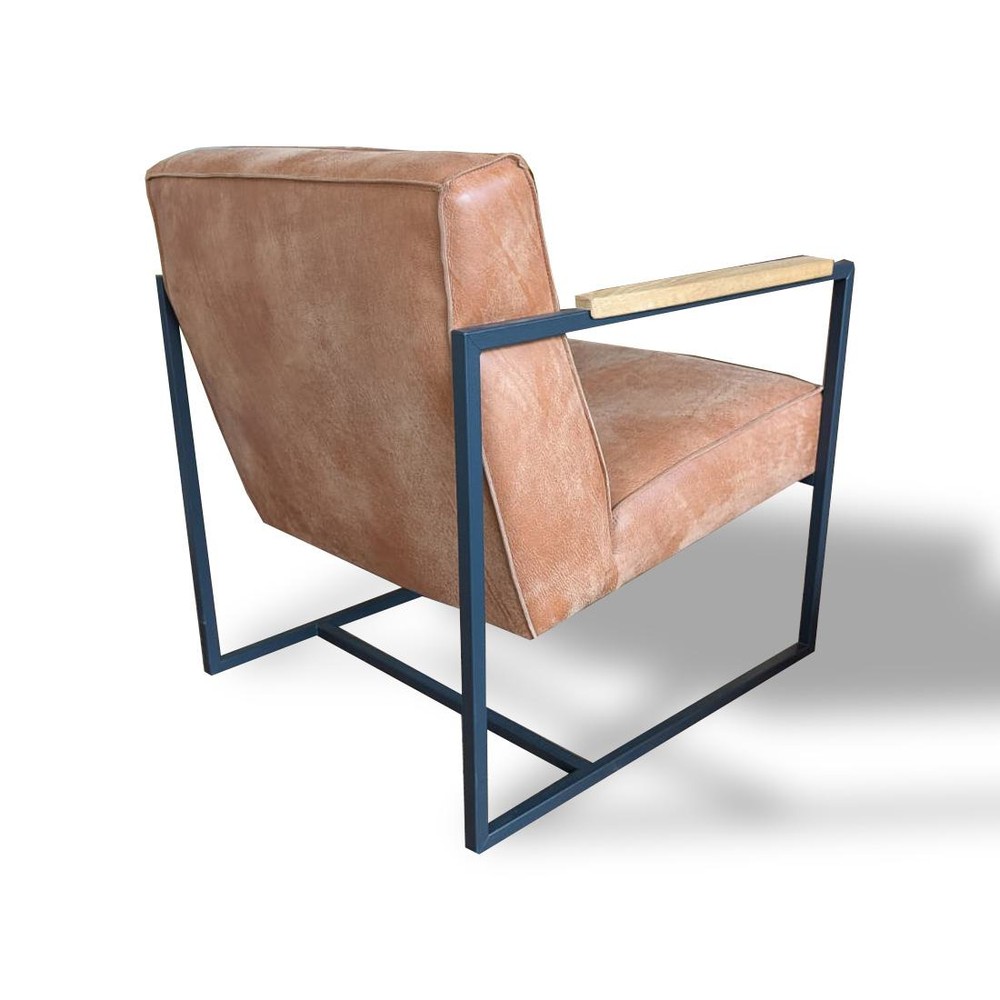 Schick, industriell, minimalistisch und langlebig. Diese vier Eigenschaften beschreiben den Sessel Bibi wohl am treffensten. Der Sessel in seiner kubischen Form besitzt einen Rahmen aus Stahl, welcher schwarz pulverbeschichtet ist. Durch das zarte, aber dicke Leder und die Armlehnen aus massiver Wildeiche bekommt der Club-Sessel seine Natürlichkeit. Das Leder ist handgebürstet und etwas angeraut. Dieser aufwändige Prozess hat den Hintergrund, dass die Sitzfläche an heißen Tagen nicht "klebt" und an Kalten Tagen schnell die Körpertemperatur annimmt und damit zu einem sehr angenehmen Sitzkomfort beiträgt.