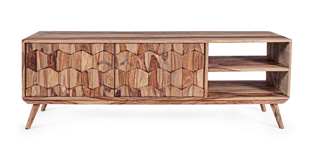 Dieses TV-Lowboard ist ein Highlight in ihrem Zuhause. Das Lowboard präsentiert eine gelungene Kombination aus Robustheit und ästhetischem Design. Das hochwertige Holz verleiht dem Lowboard eine warme und natürliche Optik. Die Maße 145 x 35 cm bieten genug Fläche für ihren Fernseher. Mit zwei Türen und zwei Regalfächern bietet dieses Möbelstück großzügigen Stauraum. Die Holzwaben schaffen einen zeitlosen Look, welcher sich gut in unterschiedliche Einrichtungsstile integrieren lässt.