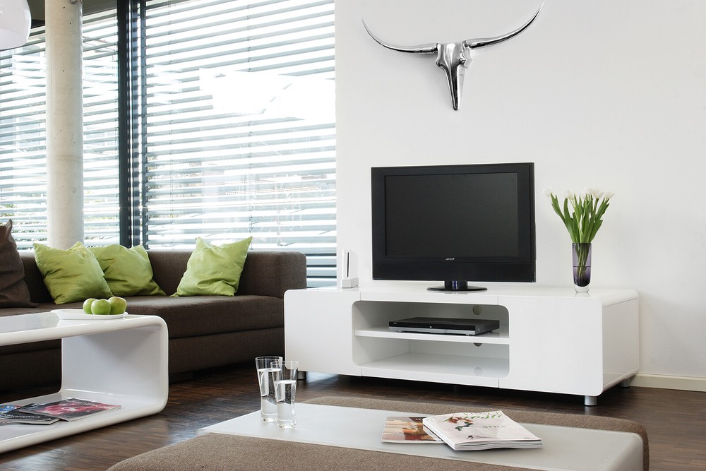 Ein Lowboard aus MDF in Weiß Hochglanz
