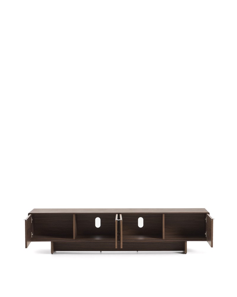 Dieses stilvolle TV-Möbel aus MDF mit edlem Walnussfurnier vereint zeitloses Design, durchdachte Funktionalität und hochwertige Verarbeitung – perfekt, um Ihr Wohnzimmer sowohl optisch aufzuwerten als auch praktisch zu organisieren. Mit großzügigen Maßen von ca. 200 x 46 x 40 cm (Breite x Höhe x Tiefe) bietet es ausreichend Platz für TV-Geräte, Multimedia-Zubehör und dekorative Elemente und fügt sich zugleich harmonisch in unterschiedlichste Raumkonzepte ein. Das Möbelstück verfügt über vier Türen mit Scharnieren, die über einen sanften Schließmechanismus verfügen, und innen verstellbare Regalböden, die eine flexible Aufbewahrung ermöglichen. So können Sie den Stauraum individuell an Ihre Bedürfnisse anpassen – ob für Bücher, Mediengeräte, Spielekonsolen oder persönliche Accessoires. Die Griffe aus gebürstetem, rostfreiem Stahl mit satiniertem Finish runden das Design elegant ab. Sie reduzieren sichtbar Fingerabdrücke und Kratzer und sorgen dank ihres leicht geneigten Designs für ein besonders komfortables Greifen und Öffnen der Türen. Die Oberfläche ist mit einer hochwertigen Polyurethan-Lackierung versehen, die das Walnussfurnier schützt und gleichzeitig für Verschleißfestigkeit sowie Feuchtigkeitsbeständigkeit sorgt. Damit bleibt das Möbelstück auch bei täglicher Nutzung lange in makellosem Zustand. Ein weiterer praktischer Vorteil ist die Öffnung an der Rückseite, die eine geordnete Kabeldurchführung ermöglicht. So lassen sich Kabel unsichtbar und ordentlich verlegen, während der verstellbare Unterbau Bodenunebenheiten zuverlässig ausgleicht und das TV-Möbel stabil und sicher aufstellt. Dieses TV-Möbel vereint hochwertige Materialien, funktionale Details und ästhetisches Design zu einem langlebigen und eleganten Möbelstück. Es schafft nicht nur Ordnung, sondern wird gleichzeitig zum stilvollen Mittelpunkt Ihres Wohnraums – ein Möbel, das Eleganz, Komfort und Langlebigkeit perfekt miteinander verbindet.