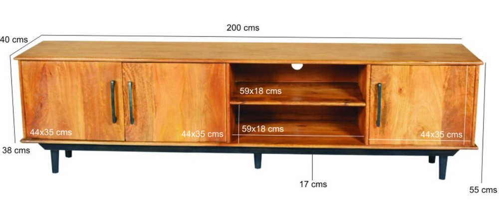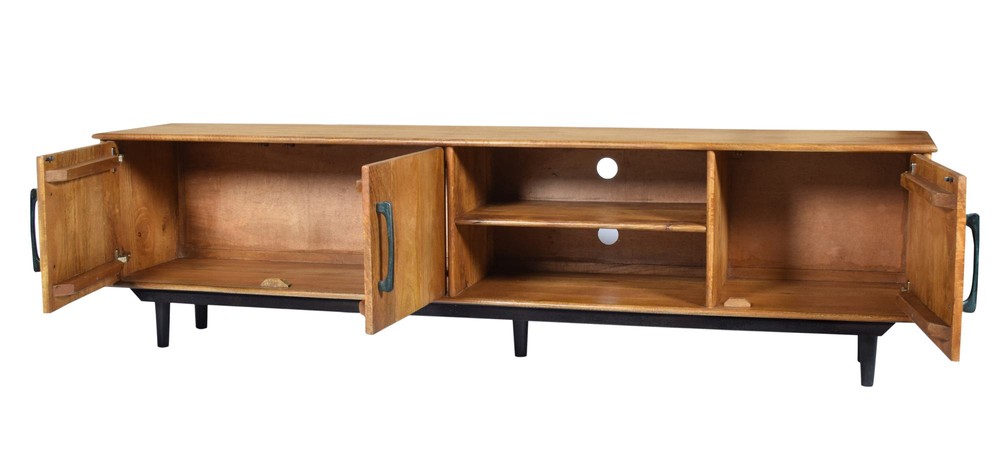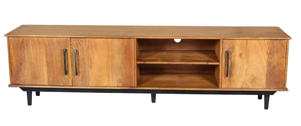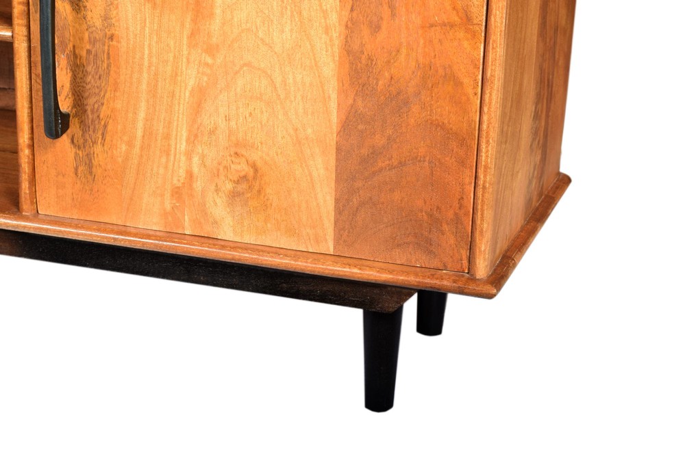 Dieser hochwertige TV-Schrank aus Mangoholz verbindet natürliche Materialien mit modernem Design und wird so zum stilvollen Mittelpunkt Ihres Wohnbereichs. Der Korpus besticht durch ein warmes, natürliches Finish, das die lebendige Maserung des Holzes besonders schön hervorhebt. Jedes Möbelstück ist ein Unikat, das durch seine hochwertige Verarbeitung und den charaktervollen Holzcharakter eine einladende, warme Atmosphäre schafft. Die Beine und Griffe des Schranks sind mit einem schwarzen Finish versehen und setzen elegante, kontrastreiche Akzente, die das natürliche Mangoholz besonders betonen. Diese Kombination aus hellen und dunklen Tönen verleiht dem Möbelstück einen modernen, zeitgemäßen Look und sorgt für eine klare, ästhetische Linienführung. Auf der linken Seite befinden sich zwei Türen, hinter denen sich ein großzügiges Fach verbirgt – ideal zur Aufbewahrung größerer Gegenstände, Medientechnik oder Alltagsutensilien. Rechts befindet sich eine einzelne Tür, hinter der sich ein weiteres Fach befindet. Diese geschlossenen Bereiche sorgen für Ordnung und ein aufgeräumtes Erscheinungsbild, während sie gleichzeitig ausreichend Stauraum bieten. In der Mitte des TV-Schranks befinden sich zwei offene Fächer mit Rückwand und einem Kabeldurchlass. Diese bieten den perfekten Platz für elektronische Geräte wie Receiver, Spielkonsolen oder Soundbars, sodass Kabel unauffällig geführt werden können und der Bereich sauber und organisiert bleibt. Die Kombination aus offenen und geschlossenen Fächern schafft eine funktionale Aufteilung, die sowohl praktisch als auch ästhetisch ansprechend ist. Mit den Maßen von ca. 45 × 55 × 200 cm (Breite × Höhe × Tiefe) bietet der TV-Schrank großzügige Ablageflächen, ohne zu massiv zu wirken. Die Oberfläche eignet sich ideal für Fernseher, Dekoration oder persönliche Lieblingsstücke. Gleichzeitig fügt sich das Möbelstück harmonisch in verschieden große Wohnräume ein und passt zu unterschiedlichsten Einrichtungsstilen – von modern über skandinavisch bis hin zu Industrial. Ein funktionales und zugleich stilvolles Möbelstück, das modernes Design, hochwertige Materialien und durchdachten Stauraum gekonnt miteinander verbindet. Dieser TV-Schrank aus Mangoholz ist die perfekte Wahl für alle, die Wert auf Qualität, Ästhetik und praktische Nutzung in ihrem Zuhause legen.