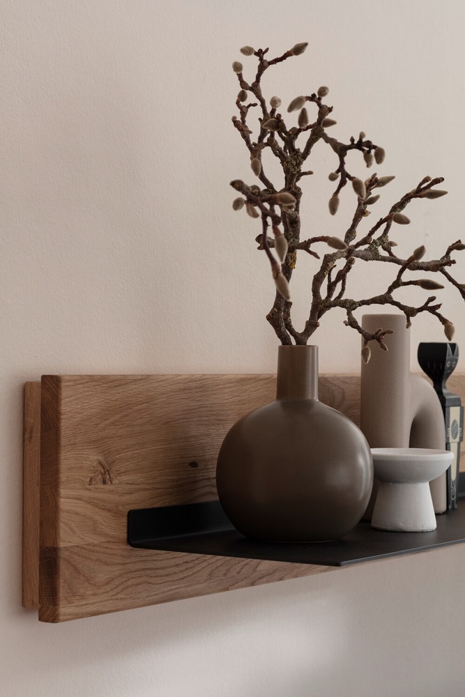 Dieses Wandboard ist ein Highlight hinsichtlich Design und Verarbeitung. Es ist aus massiver geölter Wildeiche im Roh-Effekt. Und um das ganze Erscheinungsbild nochmals abzurunden ist die Ablage aus Metall.