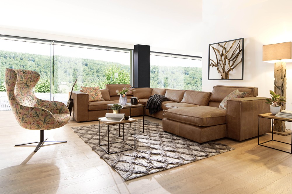 Das leicht von Hand angeschliffene, vollnarbige und naturbelassene Anilinleder dieser Wohnlandschaft ist wohl das Highlight des kompletten Sofas. Durch diesen Verarbeitungsvorgang ist die Lederoberfläche samtig weich und nimmt Körpertemperatur sehr schnell an. Das hat zum Vorteil, dass das Sofa an Wintertagen nicht "kalt" ist und im Sommer nicht an der Haut "klebt", wie man das etwa von Glattleder kennt.