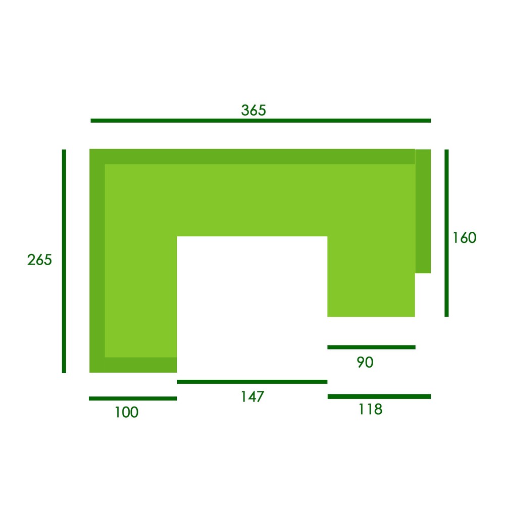 - Maße: Breite x Höhe x Tiefe: ca. 365 x 70 x 275/160 cm